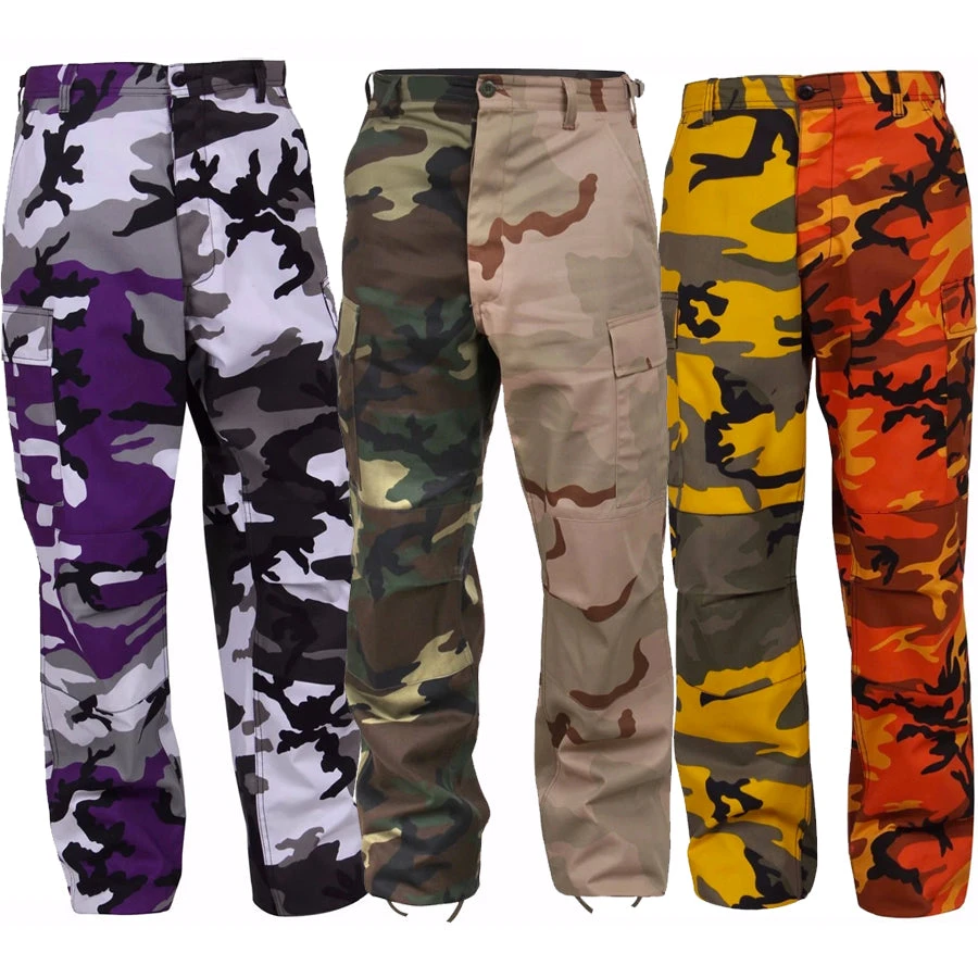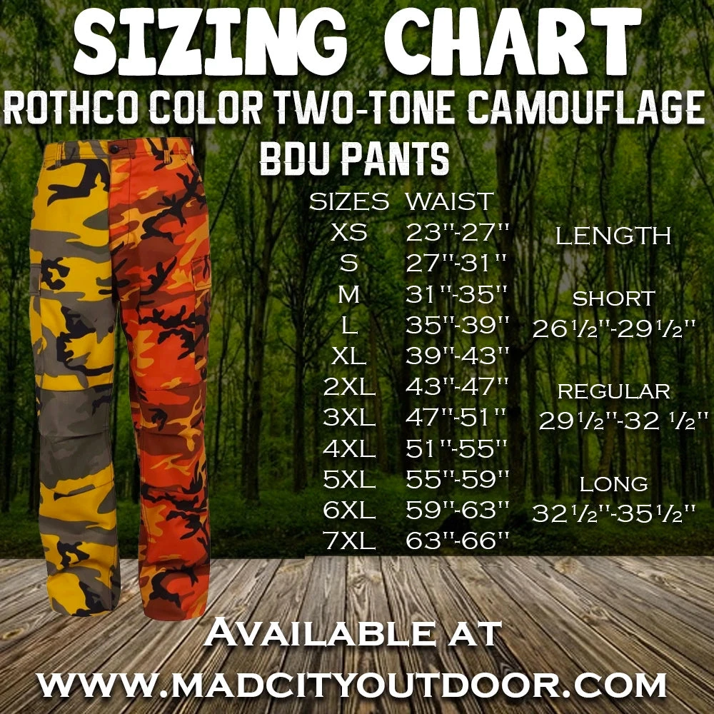 Stinger yellow / savage orange camo pants are the perfect addition pants for any urban dweller. They are bold, they are yellow and they are camo! The pants are made of a cotton/poly blend. Made by Rothco, these military yellow / orange BDU pants are comfortable and feature 6 pockets, a button fly and reinforced crotch and knees. These two-tone camouflage pants include an adjustable waist tabs, button fly and drawstring bottoms. Stand out, be bold!