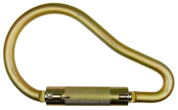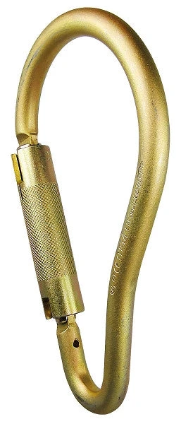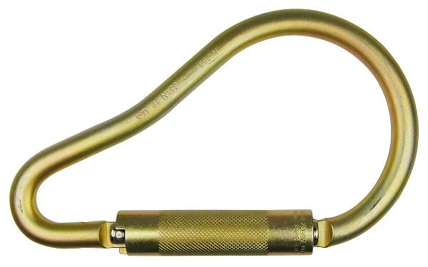 Pear shaped Ladder Hook, 2-1/4″ gate opening This round-top, jumbo carabiner is ideal for firefighters, rescue work & rigging. It has an auto-locking gate with an extra generous gate opening. It is made of high density alloy steel for extra strength. Captive eye pin included. Meets ANSI Z 359.1, 2007standards.
