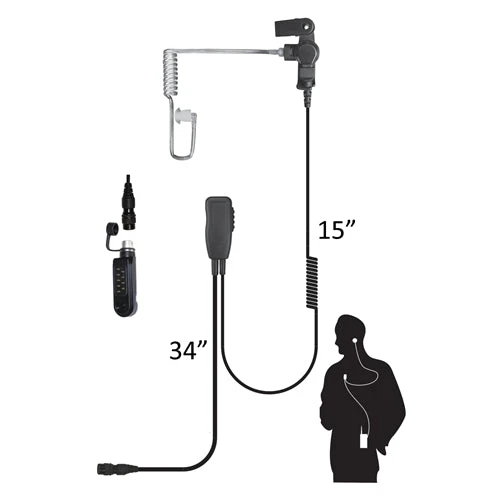 – Clear tube earpiece can be worn on either ear.