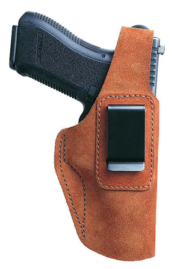 This holster offers comfort and concealability in an ultra-thin, lightweight design. Soft suede construction with an adjustable thumb break closure for multiple weapon fits for those who prefer more security. Spring steel clip keeps holster securely in place on the waist. Rust suede.