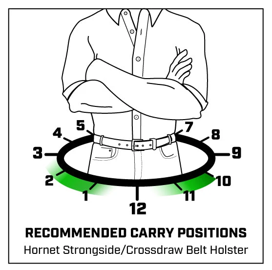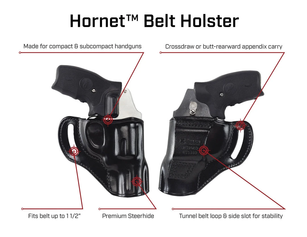 Galco Gunleather is excited to introduce the Hornet, a belt holster that carries a compact handgun in both crossdraw and the increasingly-popular appendix position. An evolution of Galcos popular and award-winning Stinger strongside belt holster, the Hornet offers comfort, speed, and concealability. Constructed of premium steerhide, the Hornet uses a tunnel-style belt loop mated with a belt slot, resulting in excellent stability on the belt. A slight butt-rear cant facilitates an easy draw from either the crossdraw or appendix position, while the open top makes the draw fast and simple. Fits belts up to 1 1/2″.