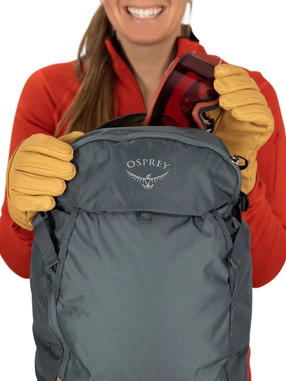 - Large front panel J-zip access to avalanche safety kit pocket with shovel handle and probe sleeves