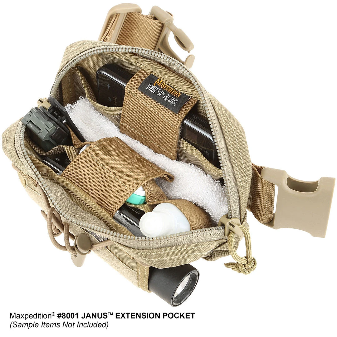 An adjustable and removable strap allows user to decide which side should face forward and whether the opening points to the left or right. The JANUS splices into 2 shoulder straps or waist straps using compatible quick release buckle components, providing additional storage for most customers or elongating a fully extended shoulder/waist strap for larger folks.
