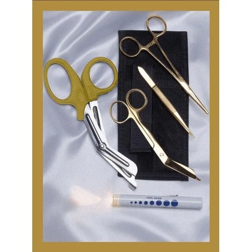 EMI’s deluxe EMS shears, all gold-plated instruments and a pupil gauge penlight. Features water repellent, 1000-padded nylon Cordura holster. Lightweight, durable, double-stitched. Snap belt loop and VELCRO-type closure. One large slide-in back pocket Two front pockets with covered flap. Measures 7 x 5 x 1/2