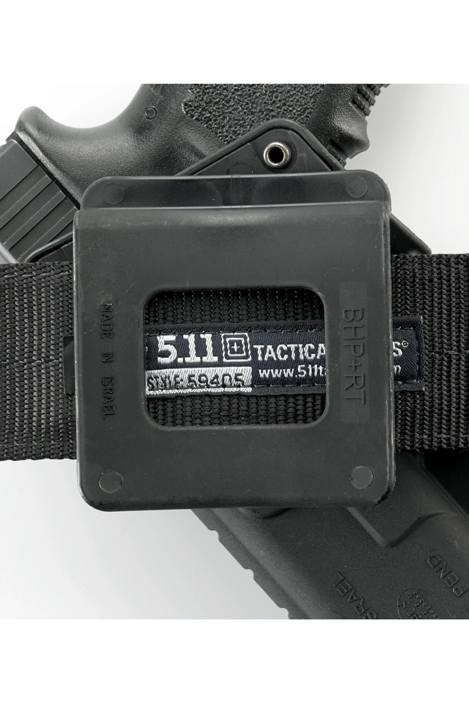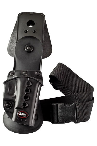 Strong two-piece thigh rig with an adjustable 1 1/2” nylon non-slip leg strap, featuring a side release buckle that keeps the holster centered during strenuous activity. Unique design accepts any Roto-Holster and is reversible for left or right leg. Thigh rig does not restrict movement.