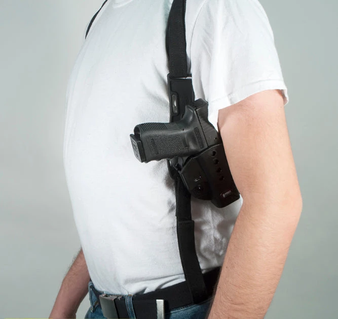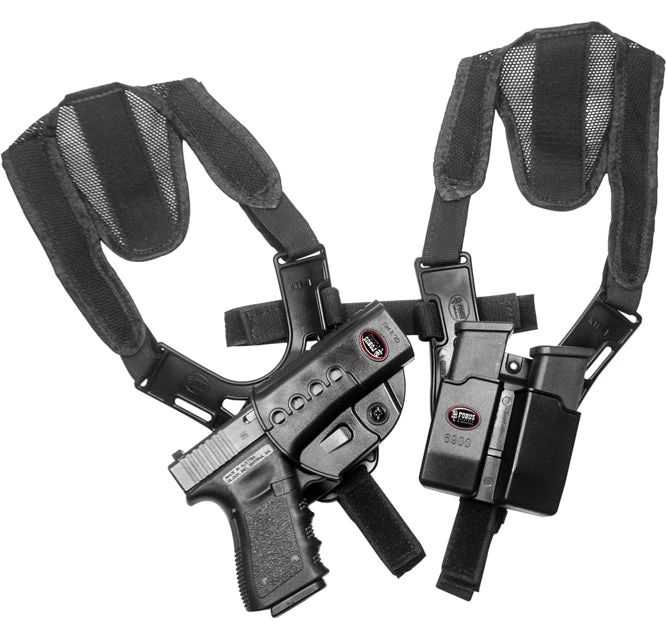 The Fobus shoulder rig accepts all Fobus rotating holsters and rotating double magazine pouches. Made of two polymer triangle adaptors connected with a set of adjustable Cordura straps, the Fobus shoulder rig is compatible for many different body shapes and sizes, and is as easy to use as it is totally concealable.