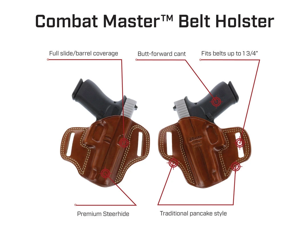 Made for semiautomatic pistols and double action revolvers, the Combat Master is available in right or left hand designs in tan or black finish.