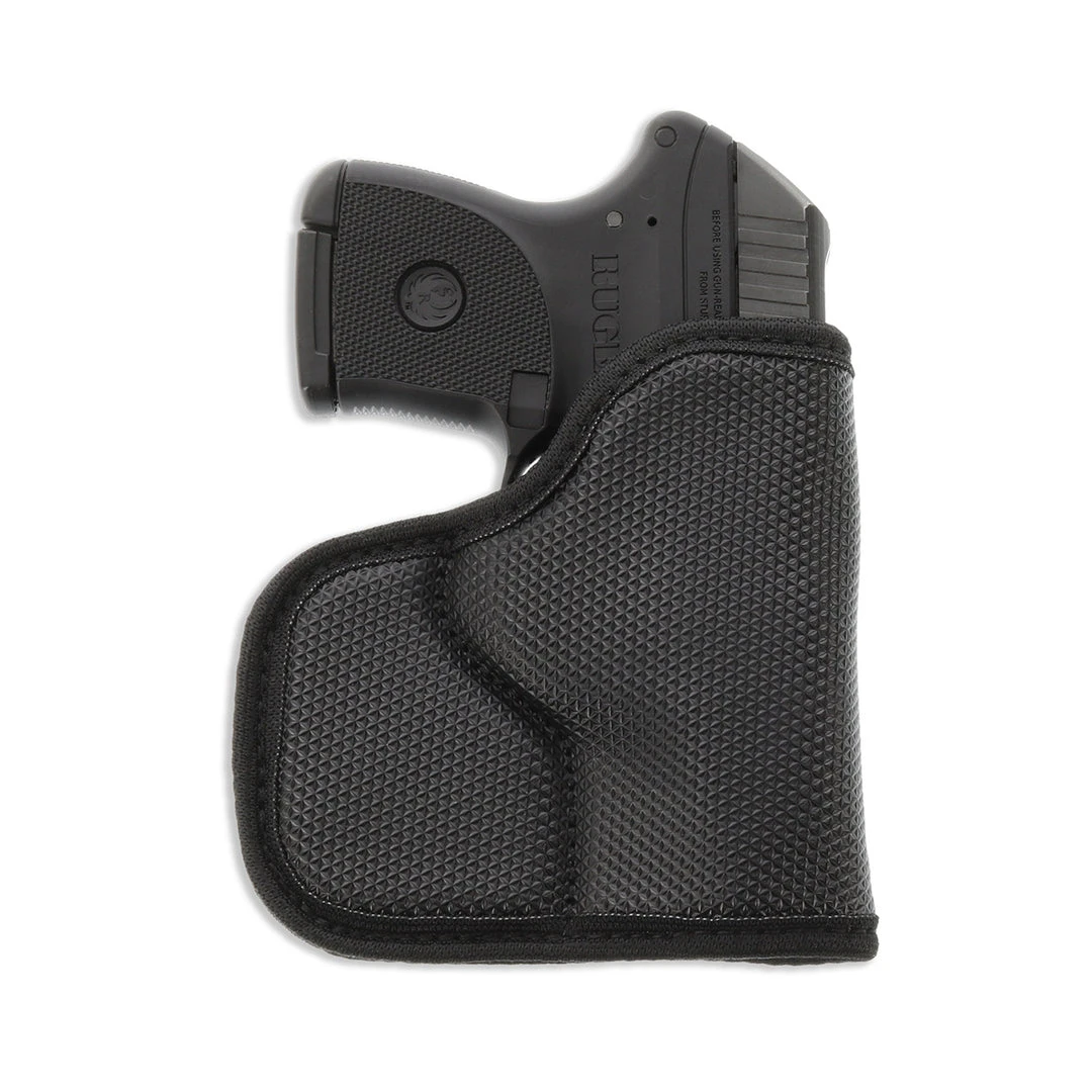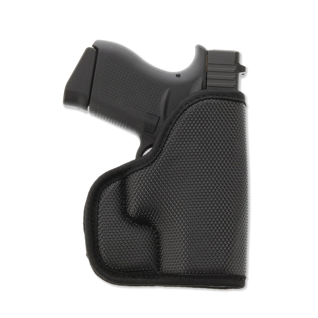 The StukOn-U is designed for front pocket carry in pants or a jacket. Galco’s pocket holsters greatly minimize the handgun from shifting in your pocket, allowing for a sure and quicker grip acquisition when drawing. The holster covers the trigger to prevent entanglement with foreign objects and adds a safety barrier between fingers and trigger when acquiring a grip. It conceals the shape of the handgun so its outline doesnt print through the pocket, and allows one-handed release of the handgun from both pocket and holster.