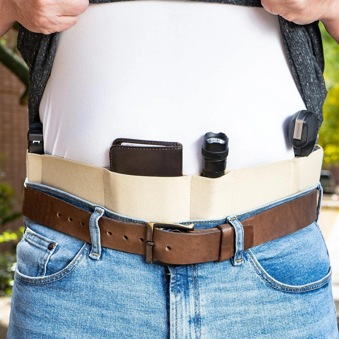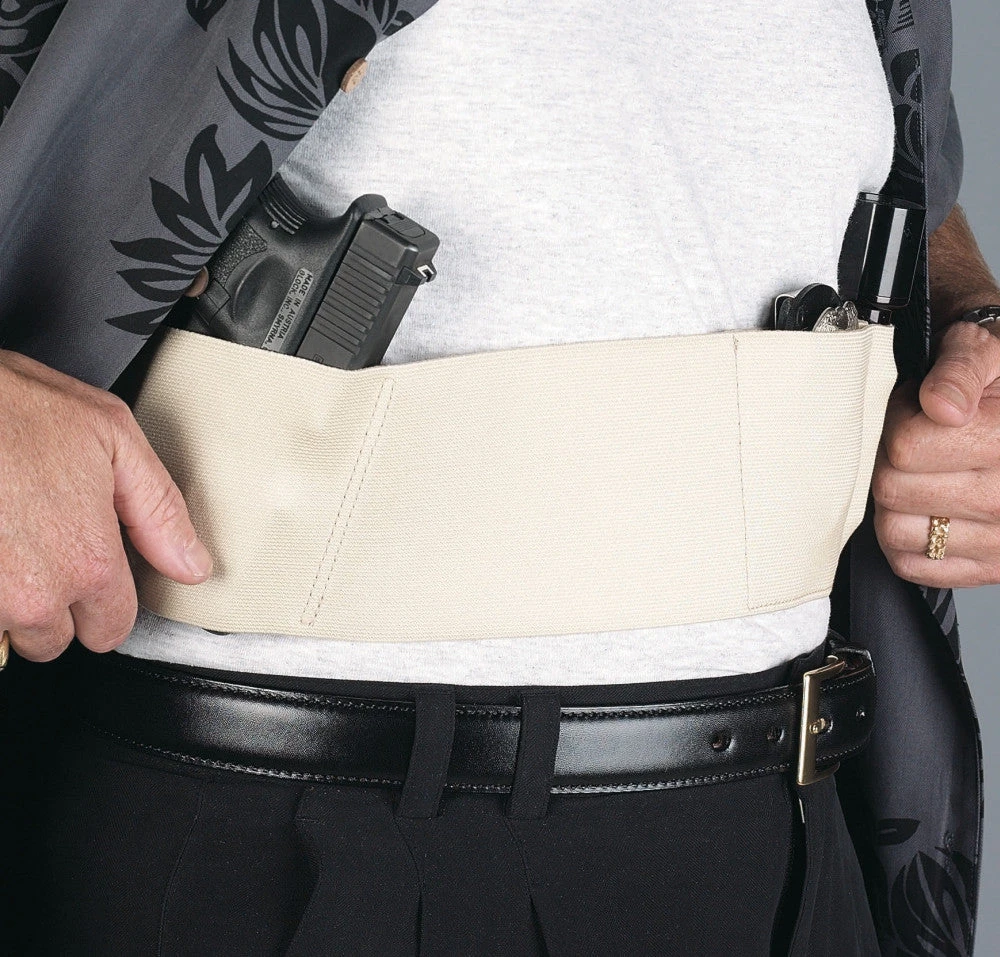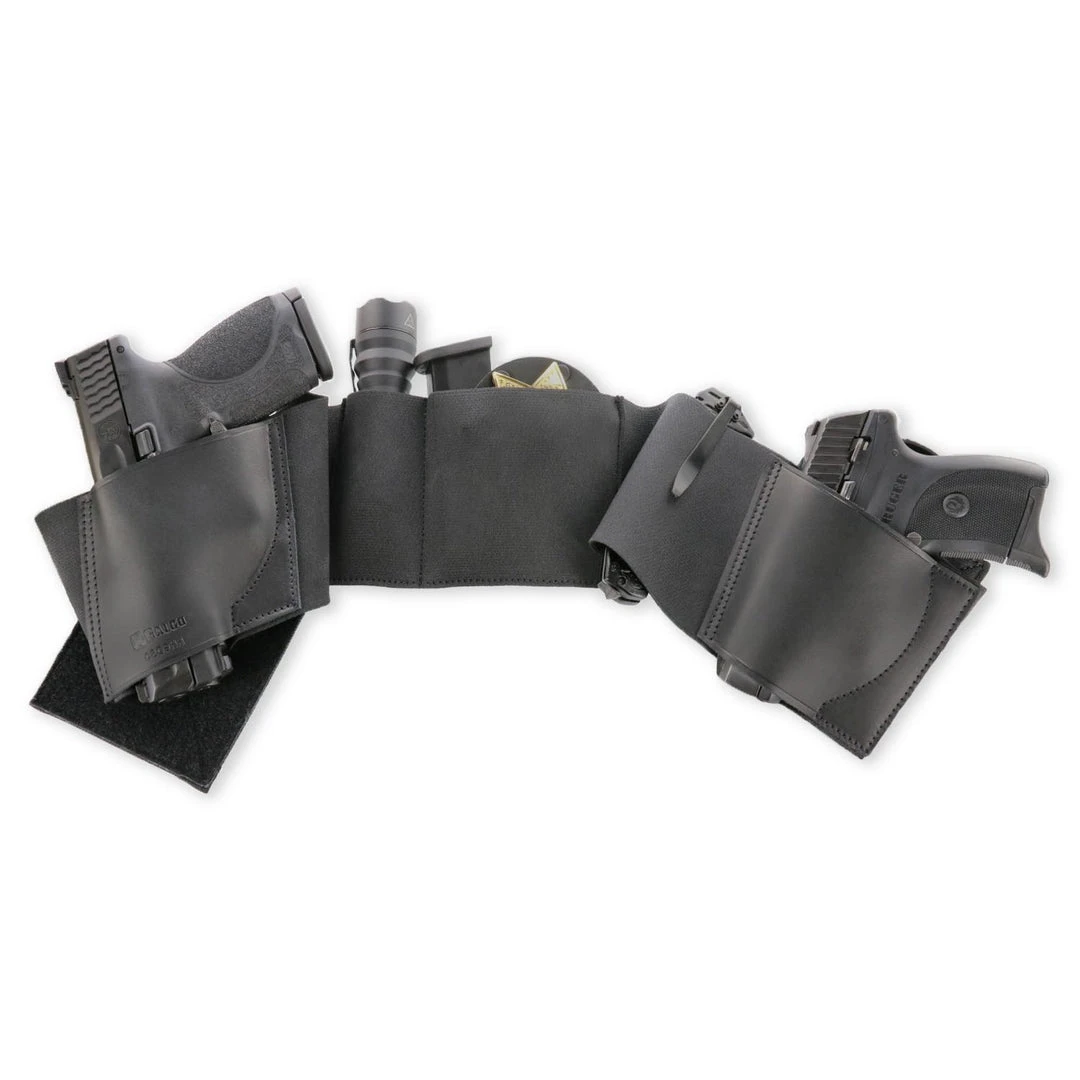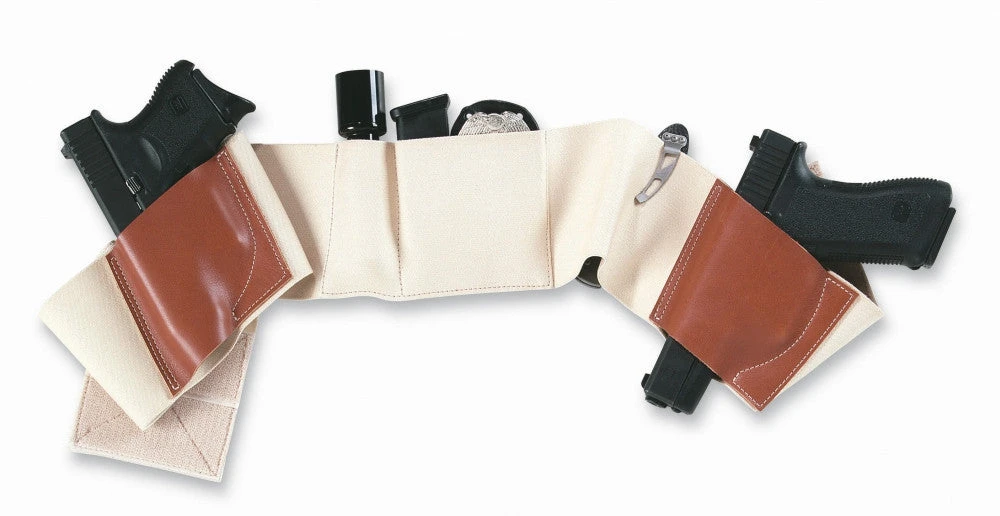 Galco’s update of the traditional belly band allows concealed carry of multiple weapons and accessories around the midsection, in an infinite variety of configurations. The UnderWraps™ also enables the user to make instant additions and changes to the carry rig. Two leather holster pockets facilitate stable positioning of one or two firearms simultaneously, while two accessory pockets accommodate badge, cuffs, ammo – you name it!