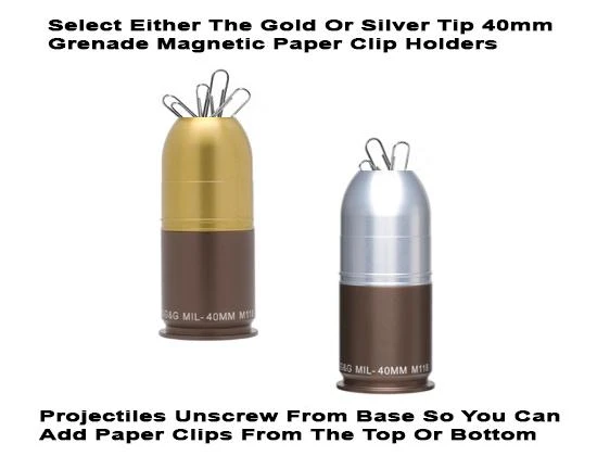 These unique paper clip holders are manufactured from solid billet 6061 T-6 aluminum and anodized in the two colors shown in the above images. They are manufactured to closely replicate the dimensions of the original 40mm grenade. The tip of the projectile is CNC machined so that the opening is large enough to easily accommodate your paper clips and fingers. Magnets are located on the interior of the opening. The projectiles unscrew so that you can load the holder from the top or the bottom.