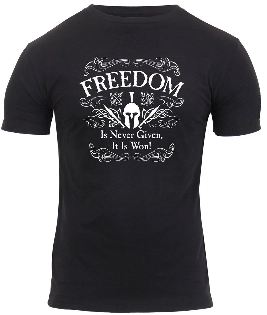 Rothco’s Athletic Fit ‘Freedom’ T-Shirt features an updated athletic fit with an insert collar, wider chest, and smaller sleeves. A “Freedom” printed graphic design is located on the center chest. The ring-spun cotton/polyester makes the t-shirt extremely soft and the tagless neck label provides added comfort for all-day wear.