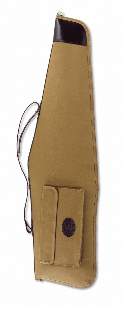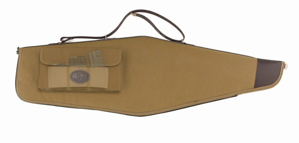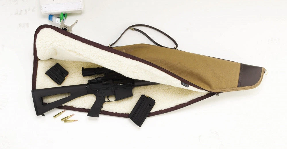 The Field Grade MSR Case is constructed of khaki cotton duck, lined with acrylic fleece and trimmed with rich dark havana leather. All hardware is solid brass. The adjustable carry handle/shoulder strap is constructed of leather. Water resistant and very functional in the field, it also has a spacious exterior pocket for up to three spare magazines.