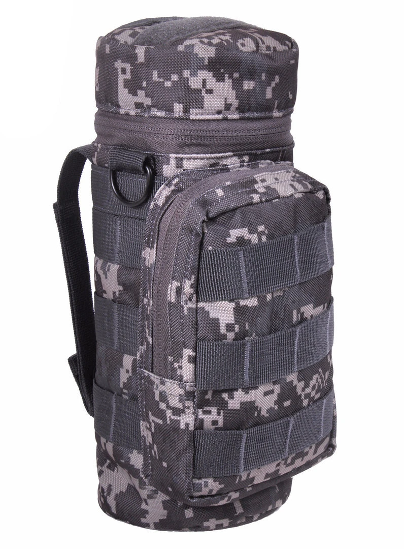 Rothco’s MOLLE Compatible Water Bottle Pouch is an ideal hydration accessory for the military and tactical market. The pouch will fit most water bottles (the main water bottle pouch is 10.5″ Tall 4″ Diameter) and securely fastens to any MOLLE attachment system. The pouch has a front zippered pouch with MOLLE loops on the front, zipper closure flip top, MOLLE loops around the entire pouch and two 6″ MOLLE straps on the back. The water pouch also has D-rings on each side and a straw hole on the top and a drain hole. Water bottle pictured is sold separately.