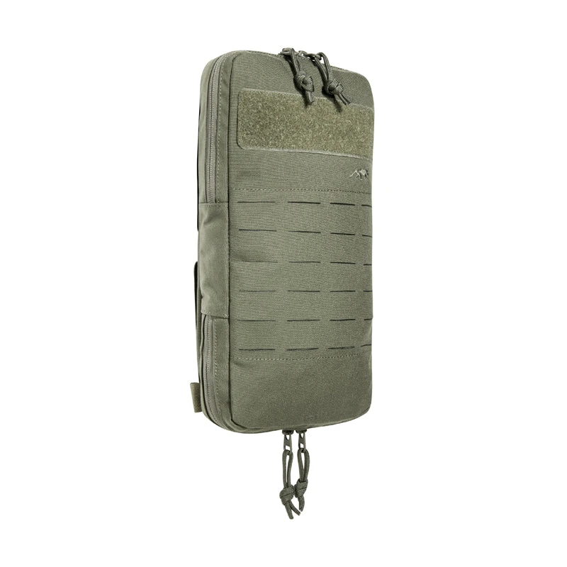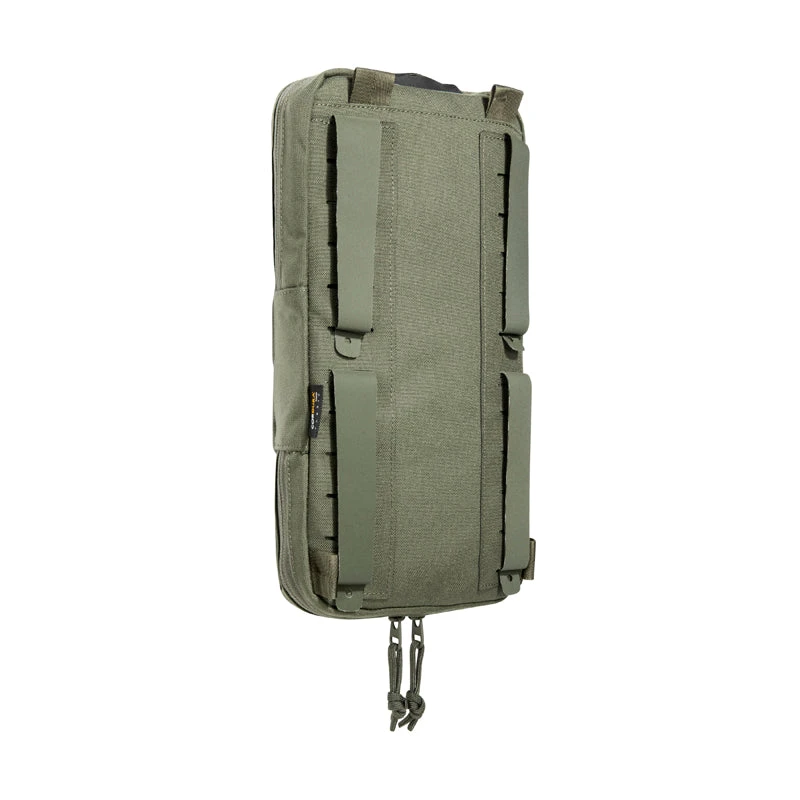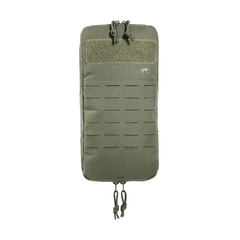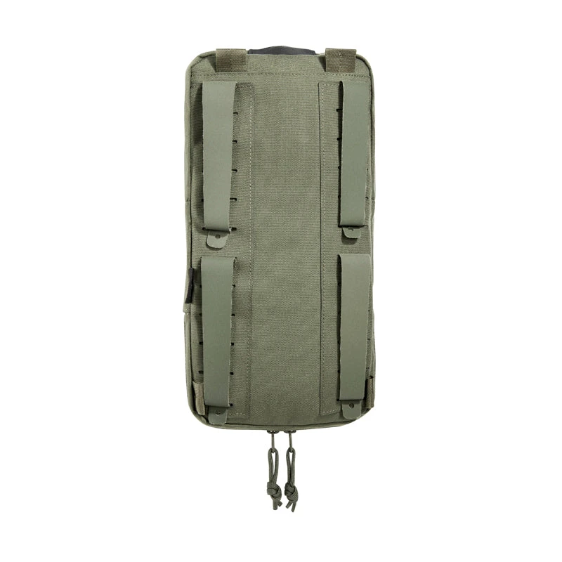 Volume-adjustable bag for hydration systems with MOLLE reverse system. The folded pouch is designed for a 1 to 1.5-liter hydration bladder. A zipper on the bottom can be used to adjust the volume for up to 3-liter bladders or to make space for other gear. The bag is specially designed to be attached to plate carriers.