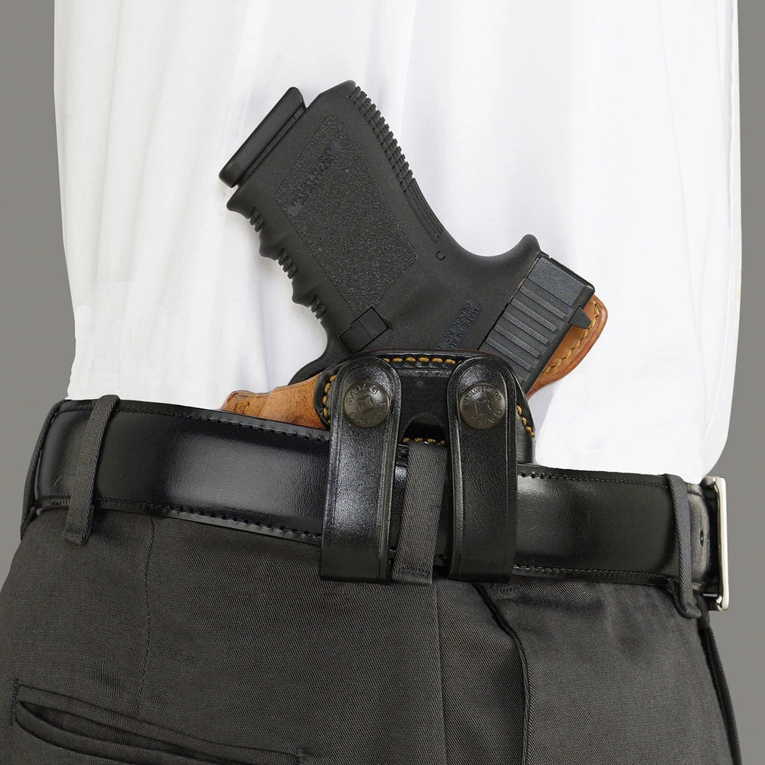 Constructed of premium horsehide, the Royal Guard has the rough side of the leather out for greater stability in the pants, while the smooth side of the leather lies against the handgun for a slicker draw feel. The butt-forward cant increases concealability when worn behind the strong hip, while the addition of a raised sweat guard protects both the handgun and the gun carrier. The new black-colored metal-reinforced mouth allows easy one-handed return to the holster. The Royal Guard is supplied with removable black belt loops fitting belts up to 1 3/4″, with optional 1 1/4″ belt loops available for wear with narrower dress belts. All these features combine to make a truly professional-grade IWB holster.