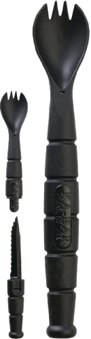 The KA-BAR Spork, which is made from food and water approved Grilamid, is equipped with a fork/spoon combo and has a 2.5″ plastic serrated knife in the handle. The knife is accessed by pulling the spork in opposite directions from each extreme end. **Hint–avoid gripping the flat panel area in the middle of the Spork–this is actually part of its lock. The tighter you hold here, the more difficult it will be for you to pull out the knife!** The Spork is 6.875″ overall and has a blade length of 2.5″. It weighs 0.1 lb. Made in the USA.