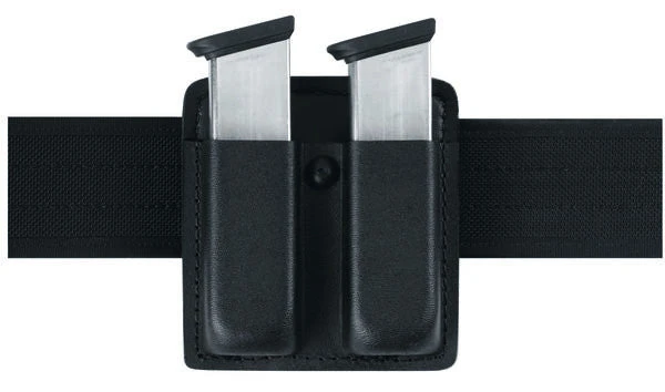 The Model 73 is an open top double magazine pouch designed to carry two magazines of ammunition on a 2.25 in. (58 mm) duty belt. It features both vertical and horizontal carry on the belt and secures the magazine in a butt-up position on the belt for easy access. A tension screw allows retention adjustment by the user. It is constructed of SafariLaminate™ and is available in four scuff resistant finishes: Plain, Basket, Hi Gloss and STX Tactical.