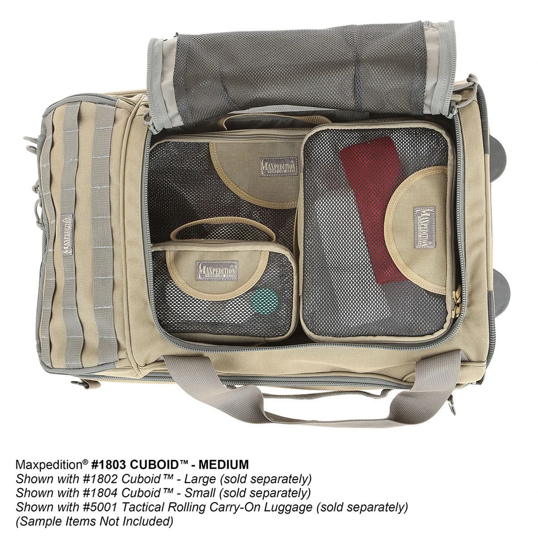 Cuboid organizers are soft containers excellent for travel and ideal for items that don’t wrinkle when folded or rolled. Their mesh areas allow viewing of contents.