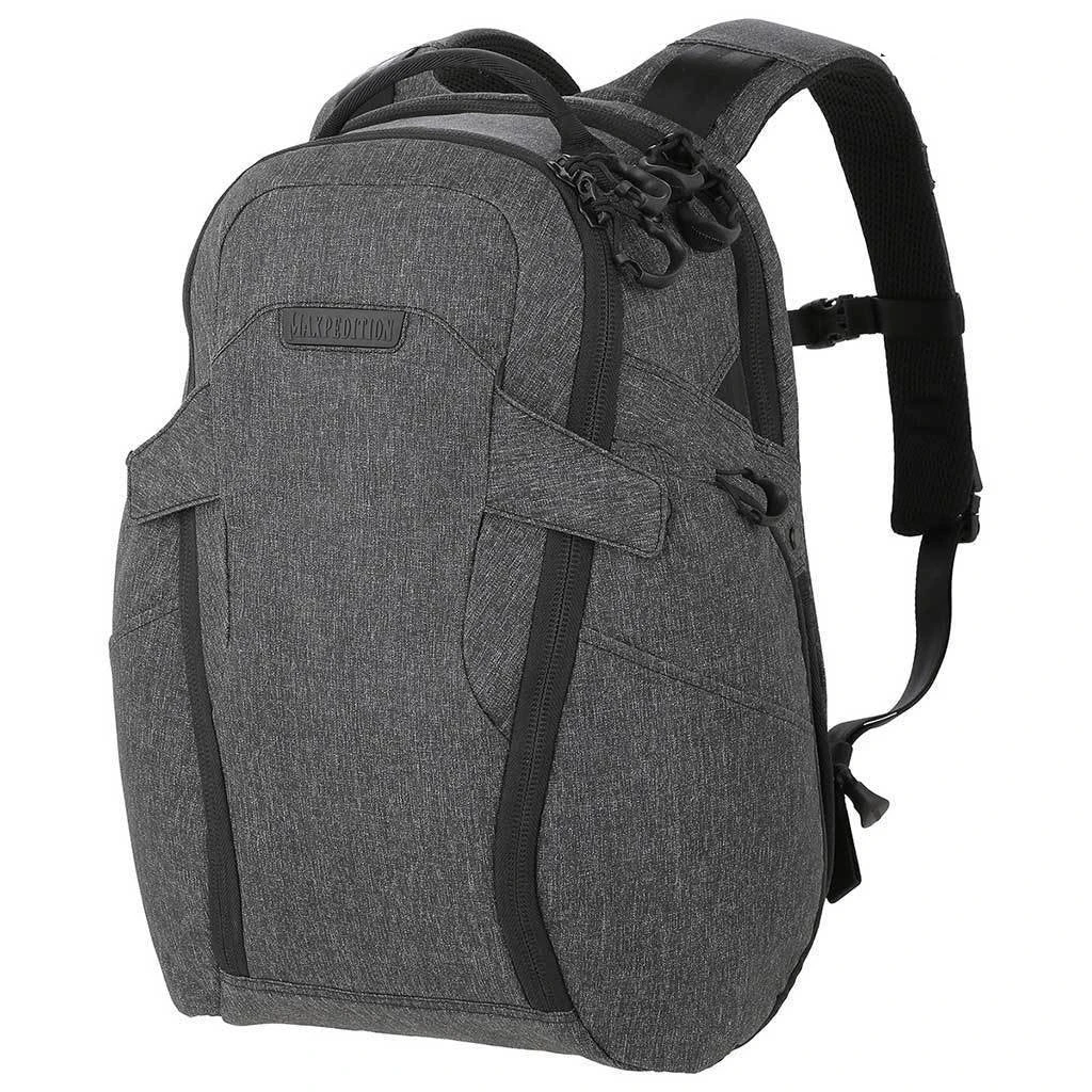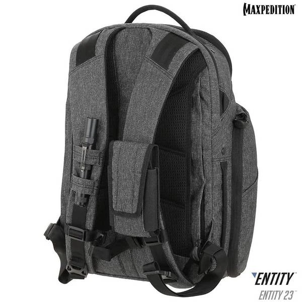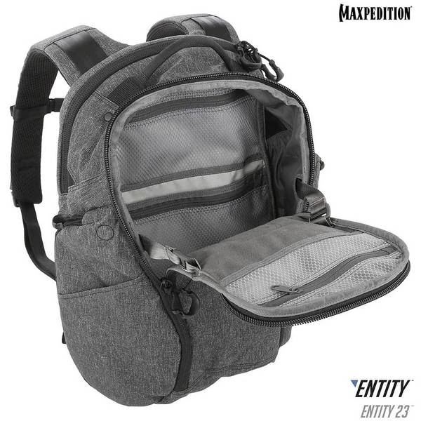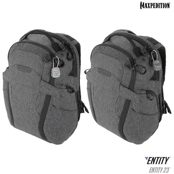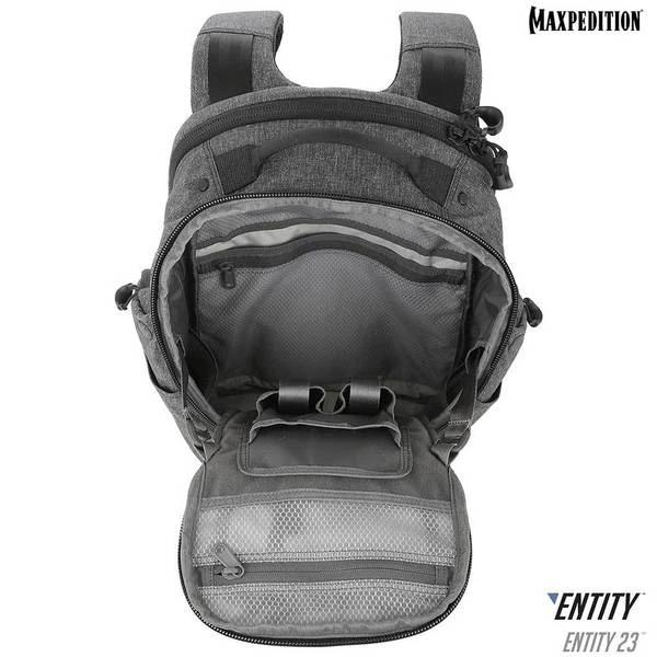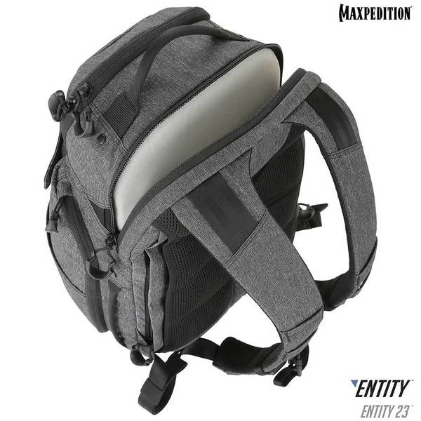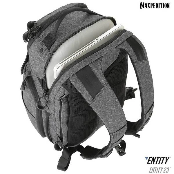 The Entity 23 is an ergonomic pack with padded shoulder straps and quick release buckles. There is a dedicated locking and padded compartment, which can hold a 15€? laptop. The main compartment is also lockable, and has drawbridge straps for additional security. The front exterior has tuckable magnetic wings for quick temporary closing of the main compartment. The dual access rear CCW compartment is fully loop-lined, and a double-sided hook Security Lockout Strip is included. Dual side ports are perfect for headphones, charger cables, etc. A rear trolley handle pass-through allows for off body carrying while travelling.