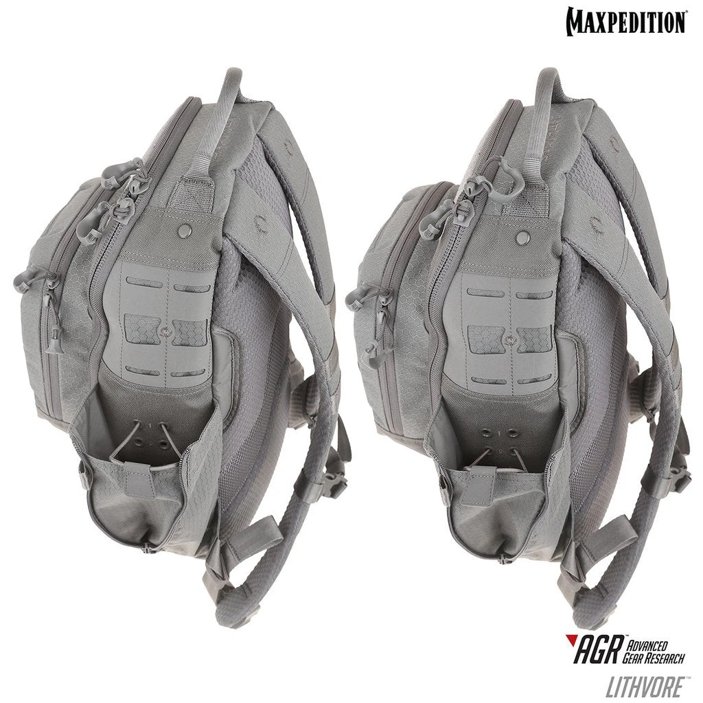 The Lithvore is an ergonomic backpack with padded shoulder straps. There is a top loop field for patch adhesion, a front admin pocket for added organization, a bottom shock cord retention array, two (2) expandable bottle pockets with dual zipper garages, and a fully opening main compartment.