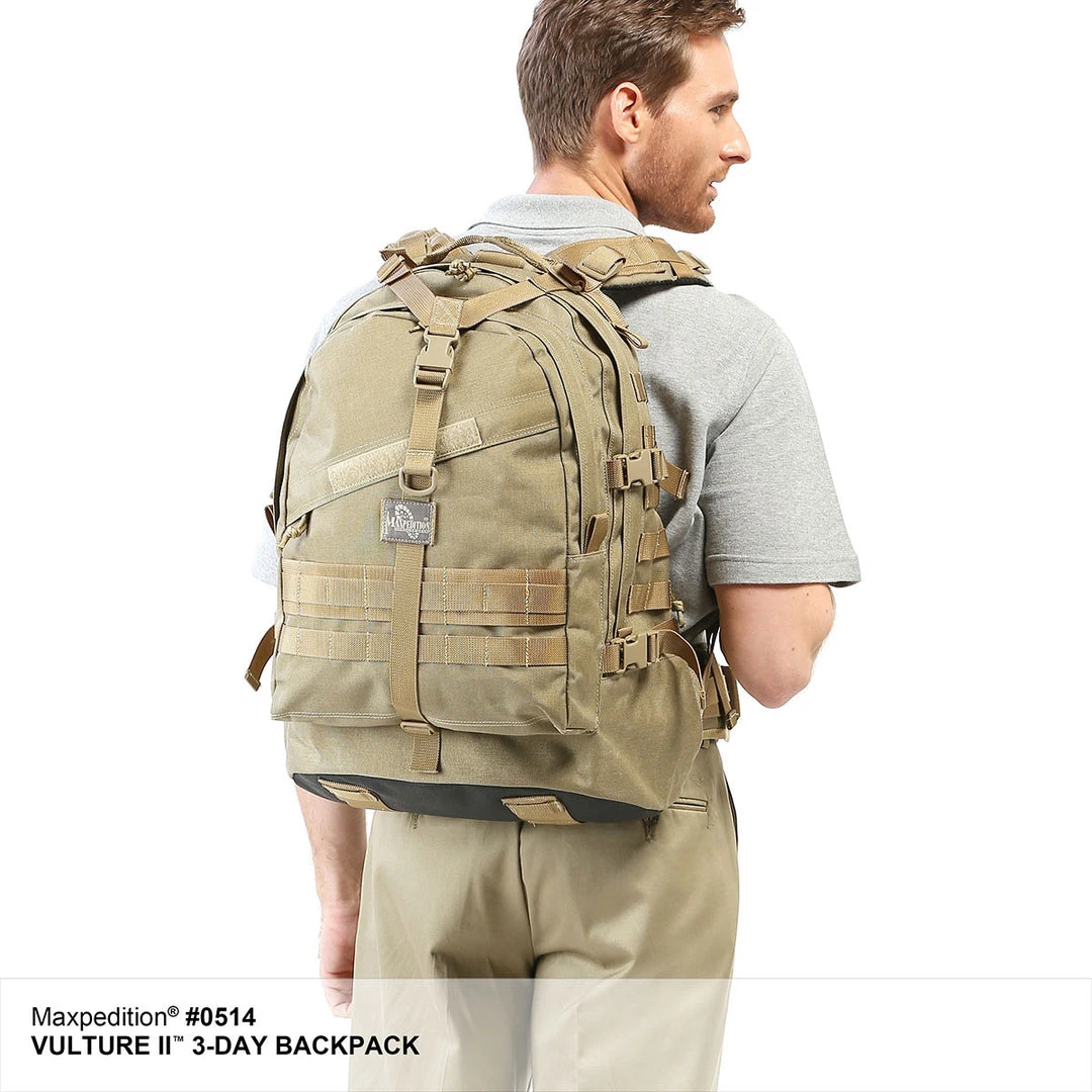 The Vulture-II 3-Day Backpack is designed for hauling lots of gear. Endowed with 2100 cubic inches (34 liters) of carry capacity, 3 generous compartments, and a wide bottom design; this is the backpack to pack it all into. However, like all Maxpedition® bags, size does not infringe on comfort. The Vulture-II holds true to the Maxpedition ergonomic standard and comes equipped with comfortable back padding, curvaceous backpack straps, concealable chest & waist straps. The Vulture-II also accommodates up to 100oz/3L hydration reservoir with bi-directional tube port (not included), and has plenty of exterior PALS webbing for attaching Maxpedition pouches and accessories. Great for longer hikes, deployment, or buggin’ out.