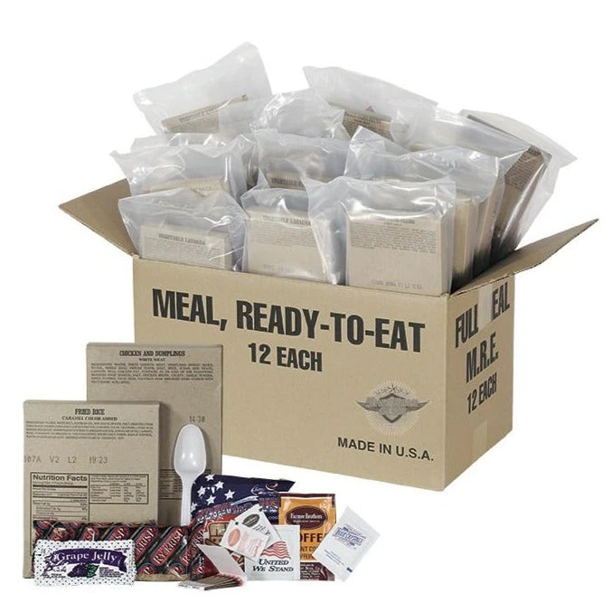 - Each meal contains: main dish entre, side dish, snack, dessert, beverage powder, and condiments