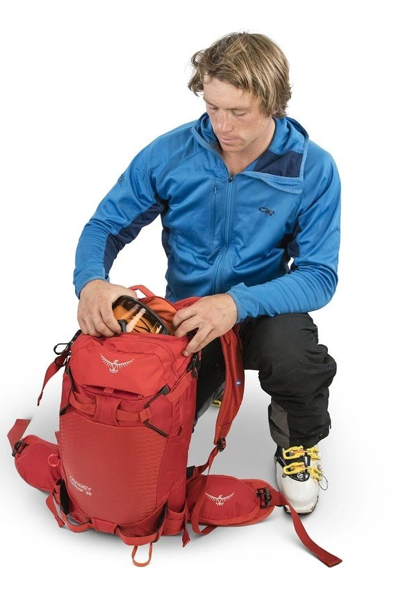 - Panel Load Access – Extra-large front panel j-zip access to avalanche safety pocket with shovel handle and probe sleeves