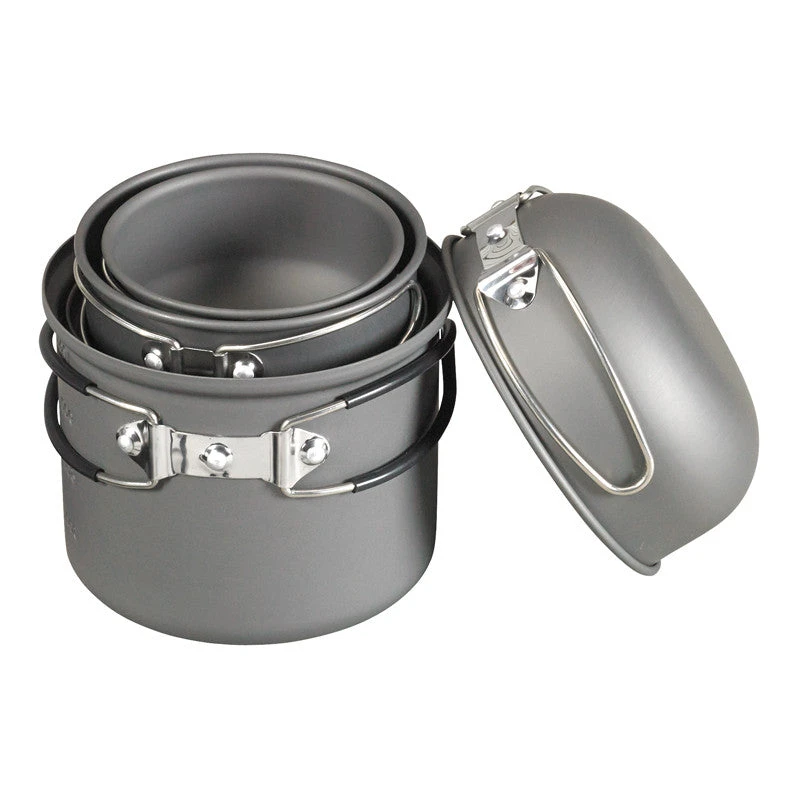 The NDūR 6 Piece Essentials Cookware Kit is perfect for cooking up a meal for 1-3 people. Made of Anodized Aluminum, it is extremely lightweight and easy to clean. The surface treatment is FDA and LFGB food safety approved. Includes 3 pots with handles and 3 bowls/cups with handles. It comes with a mesh carrying pouch. The surface treatment is FDA and LFGB food safety approved.