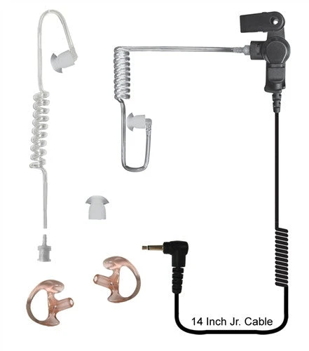 Our Listen Only Acoustic Coil Tube Earpiece with 14″ cord and 3.5 connector is for use with Shoulder Microphones with a 3.5 mm earphone jack.