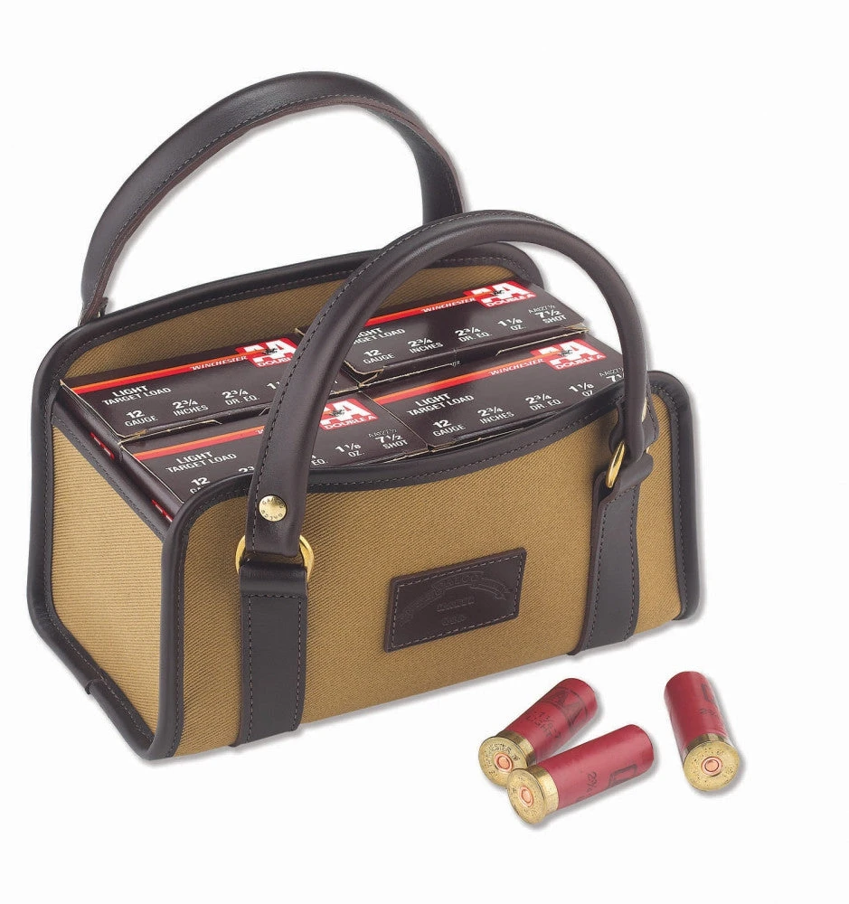 Constructed of durable canvas cotton twill, lined with water resistant nylon and trimmed in dark havana leather, it conveniently carries four boxes of shells. Seams are piped and bound for reinforcement.