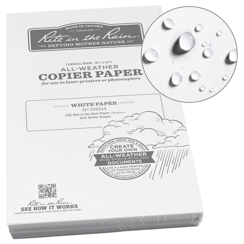Work efficiently regardless of your work environment. Copy or laser print your own all-weather forms, charts, maps, and worksheets on a paper that can survive. Print your own all-weather documents, maps, and photos on paper that can survive any outdoor office. Even in extreme conditions, toner won’t rub or wash off Rite in the Rain printer paper. Our archival-grade and water-resistant paper will defend your prints against Mother Nature & Father Time.