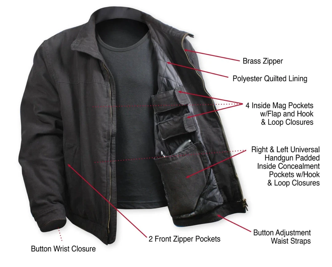 Rothco’s 3 Season Concealed Carry Jacket will keep you warm from the fall to the spring season; the jacket features a washed 100% cotton outer shell and polyester inner lining. The casual jacket comes with a tactical twist it features two inner concealment pockets (one on each side) with hook & loop closures and four inner mag pockets with hook & loop flap closure. Additional features include; two tricot lined front zipper pockets, button closure wrists, and button adjustment waist straps.