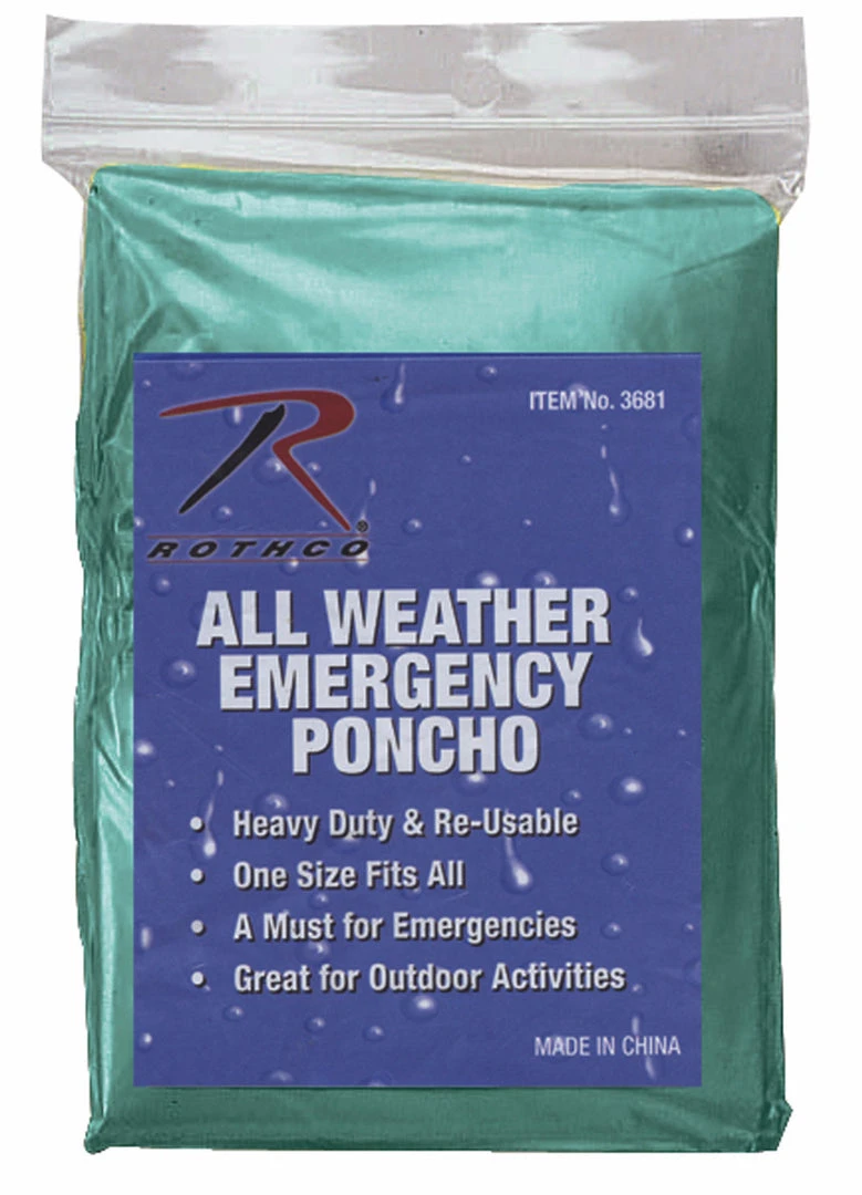Rothco’s All Weather Emergency Rain Poncho is lightweight yet durable, reusable and easy to pack which makes it ideal for carrying in case of an emergency or for outdoor activities. Also a perfect addition to your bug out bag or camping pack. This is a one size fits all rain poncho measures 50″ x 80″ and features a hood to protect you from the elements.