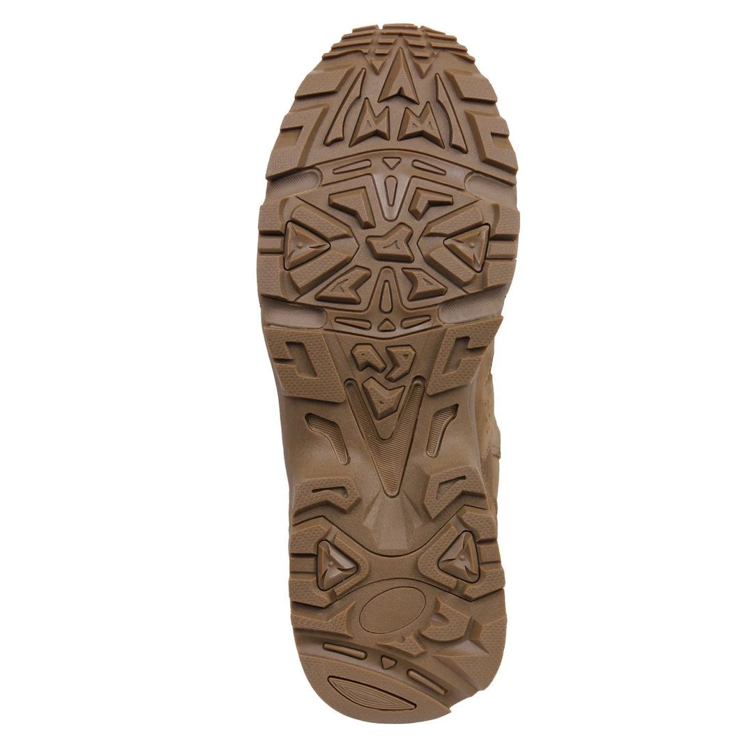 Rothco’s Coyote Brown Force Entry Tactical Boot is completely compliant to military regulation AR 670-1 (DA PAM 670-1, Section 20-3 Boots) Standards. This includes a height of 8″ (measured from the ground at back center), an upper flesh side out cattle hide leather (nubuck) with nylon, a plain toe, a rubber outsole matching the upper in color, “cambrelle” synthetic lining (no mesh), and soles that measure 1.75″ in height (measured from the bottom of the outsole) and don’t extend over the toe. Other features of this combat boot include double side vents, 7 eyelet lace system, (with 4 speed laces), a padded collar for additional support, and removable insoles.