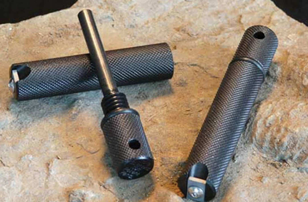The survival tool you want to have in an emergency situation, the Aurora Fire Starter. Create a spark by striking the ferro-magnesium rod with the stainless-steel blade at the outside base of the cylinder. The cylinder and rod of this fire starter screw together at an O-ring to create a waterproof seal, protecting the rod from corrosion. This survival fire starter is constructed with knurled anodized aluminum for durability. The self- contained design of this survival tool makes for easy storage and carry in your bug out bag or camping backpack. This camping fire starter is made in the U.S.A..