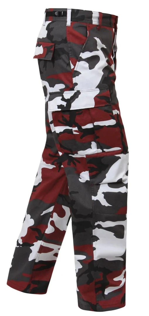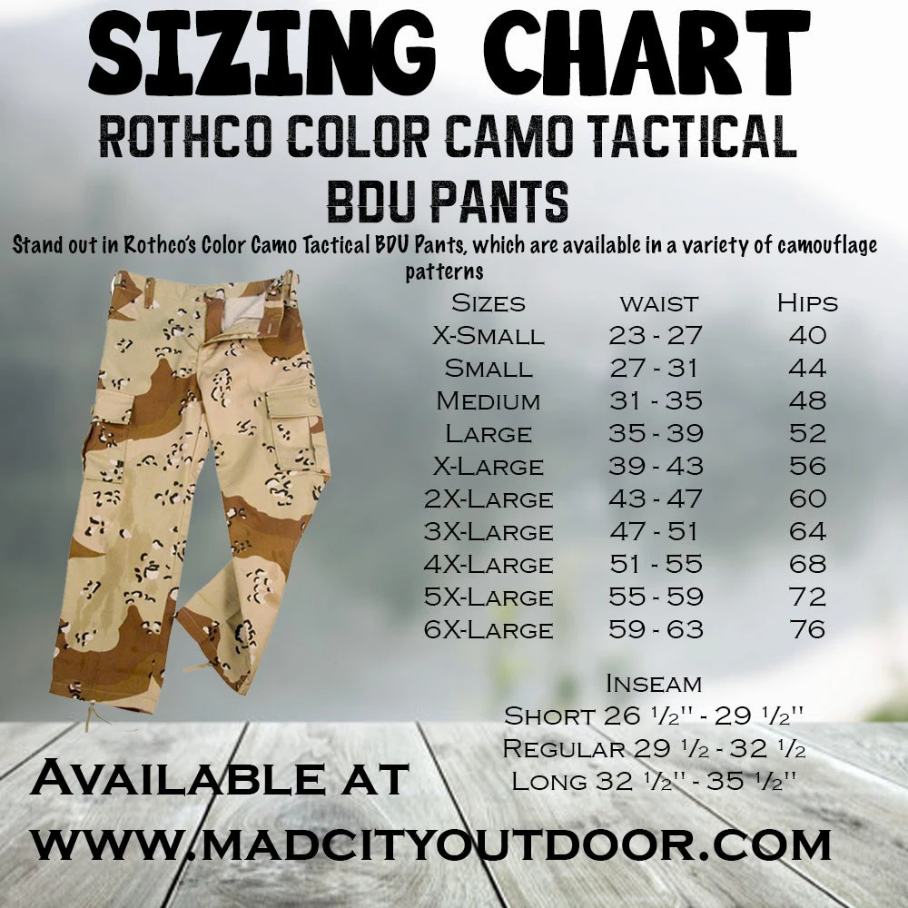 The Rothco Camouflage BDU Pants are the perfect addition pants for any urban dweller. They are bold and they are camo! The pants are made of a cotton/poly blend. Made by Rothco, these military BDU pants are comfortable and feature 6 pockets, a button fly and reinforced crotch and knees. These camouflage pants include an adjustable waist tabs, button fly and drawstring bottoms. Stand out, be bold! These camouflage tactical pants is the perfect urban outfit for those looking to standout.