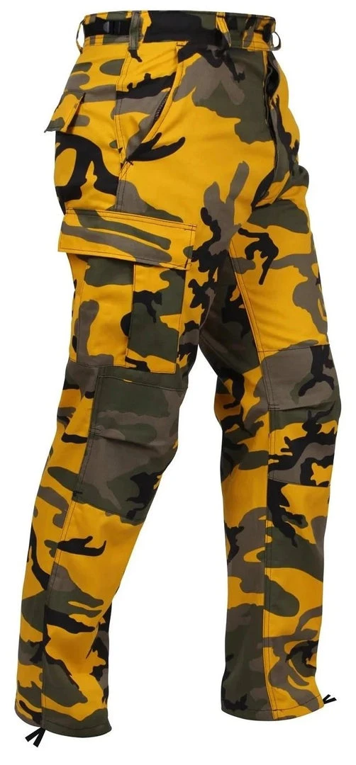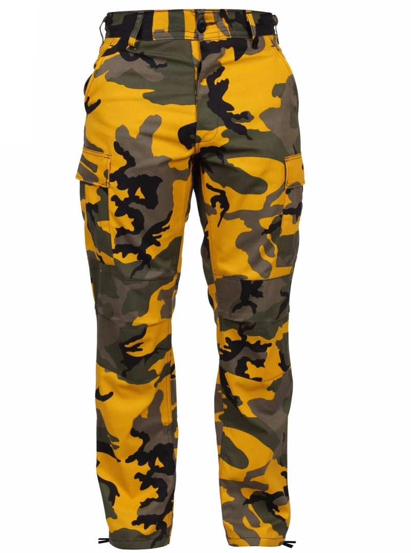 | Yellow camouflage is worn by those who seek happiness, wisdom and imagination. The yellow camo pants are a popular choice for dance groups and those who are known for their confidence, playful demeanor. What colors match yellow camo pants? The question should be, what color doesn’t go with yellow? |