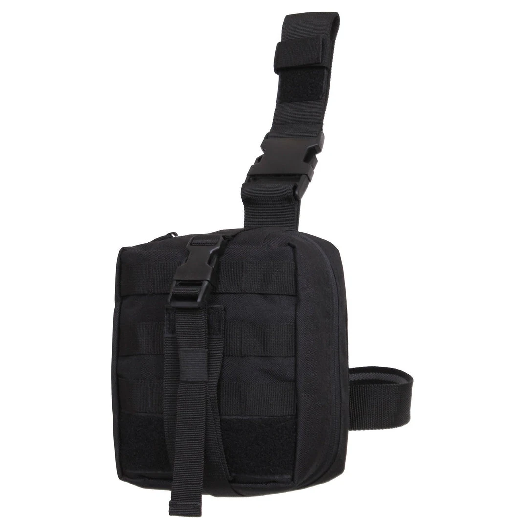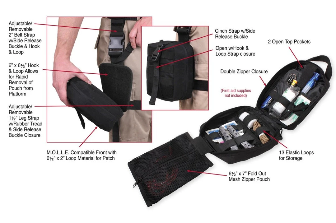 Rothco’s Drop Leg Medical Pouch is a MOLLE compatible tri-fold out pouch that attaches to the belt and leg that is ideal for securely storing essential first aid and medical supplies. The MOLLE pouch features a tear away loop platform for quick removal and cinch straps with side release buckles, allowing for quick and easy access to the contents of the tactical medical pouch. The drop leg medical pouch features 13 elastic storage loops (11 inner elastic straps/ 2 string loops), a mesh zipper fold out pouch, and 2 open top pockets. A double zipper closure ensures the contents are secure and easy to access. The MOLLE pouch will fit belt loops up to 3″ wide.