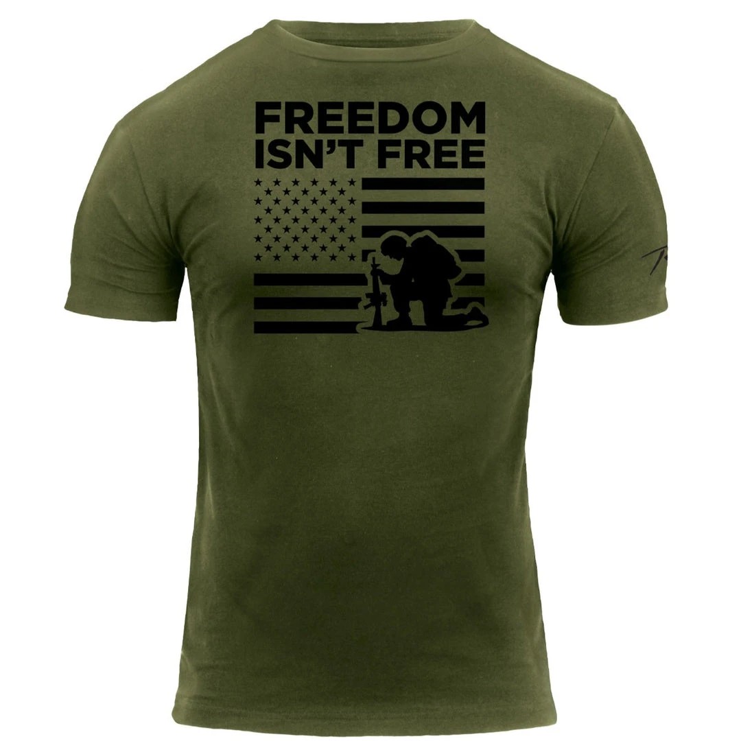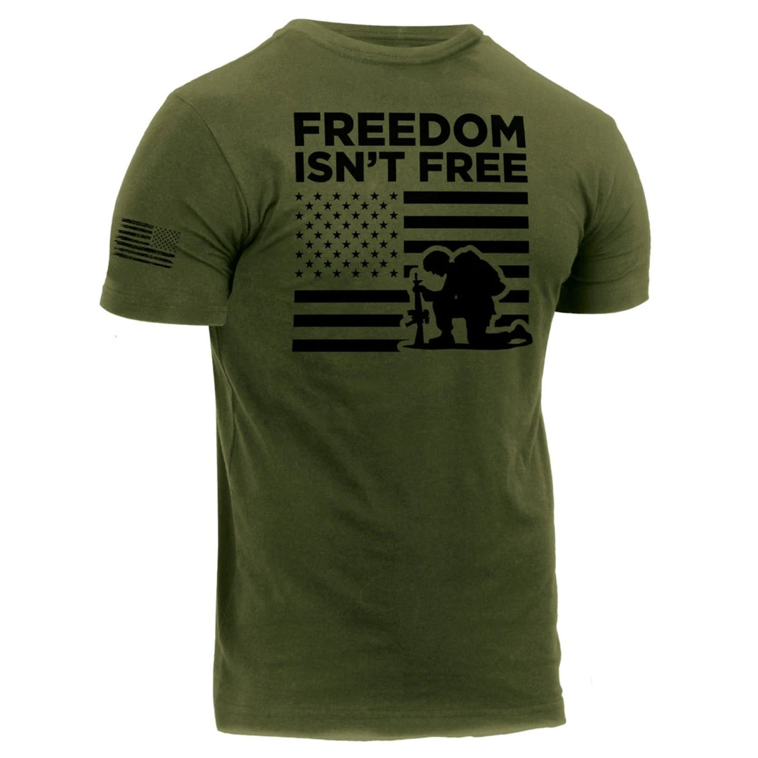Rothco’s Freedom Isn’t Free T-Shirt features a horizontal US flag with “Freedom Isn’t Free” lettering on top and a kneeling soldier within the flag print. The right sleeve features a distressed US flag graphic, while the left sleeve includes a Rothco brand “R”. Made of a cotton / polyester blend and built with a tagless label, the freedom shirt is designed for maximum comfort and provides a lightweight feel. Rothco’s Freedom Is Not Free Shirt is a great shirt for Veteran’s Day, Memorial Day, the 4th of July, or any occasion!