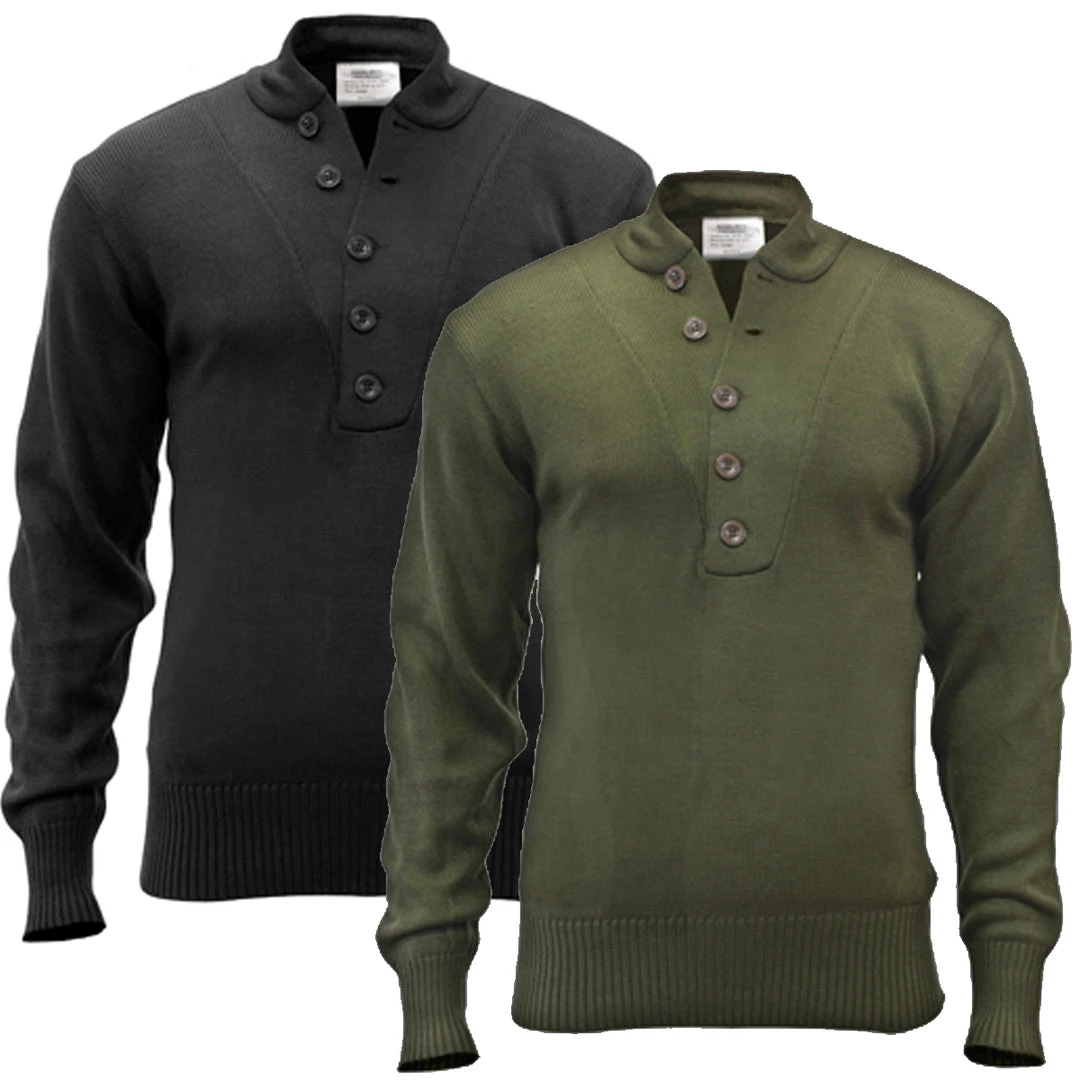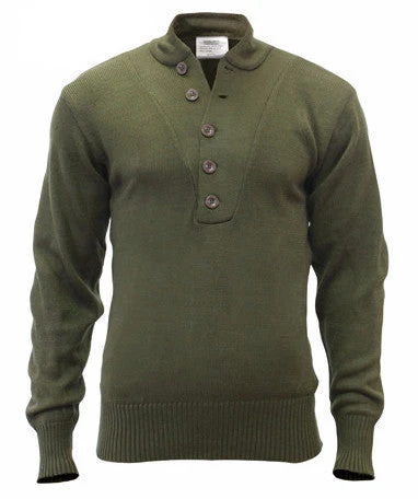 Warmth and style? Yes–you can have both with this GI style 5-button Acrylic Sweater. The sweater is 100% acrylic, elastic knit cuffs to keep you warm and a 5-button front.