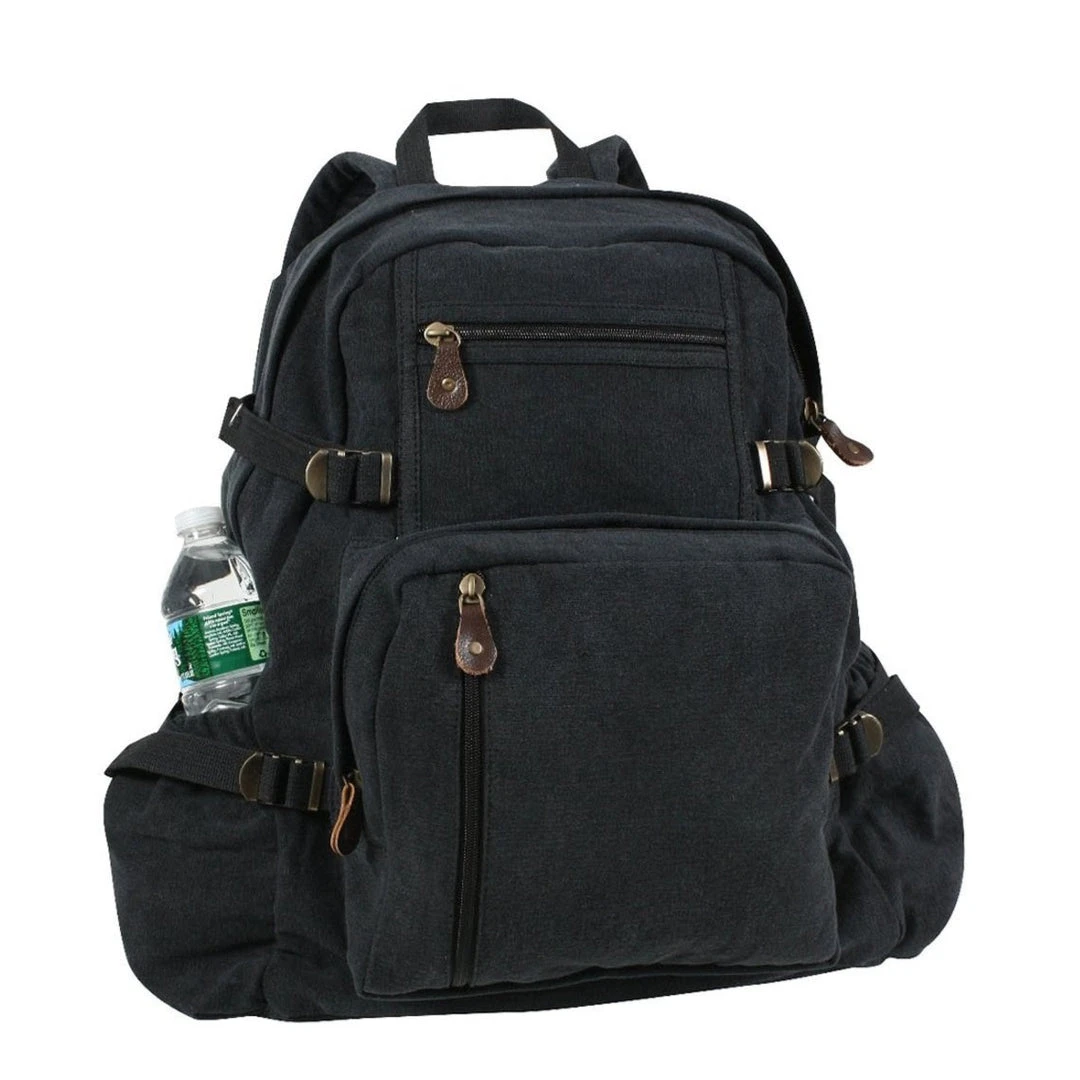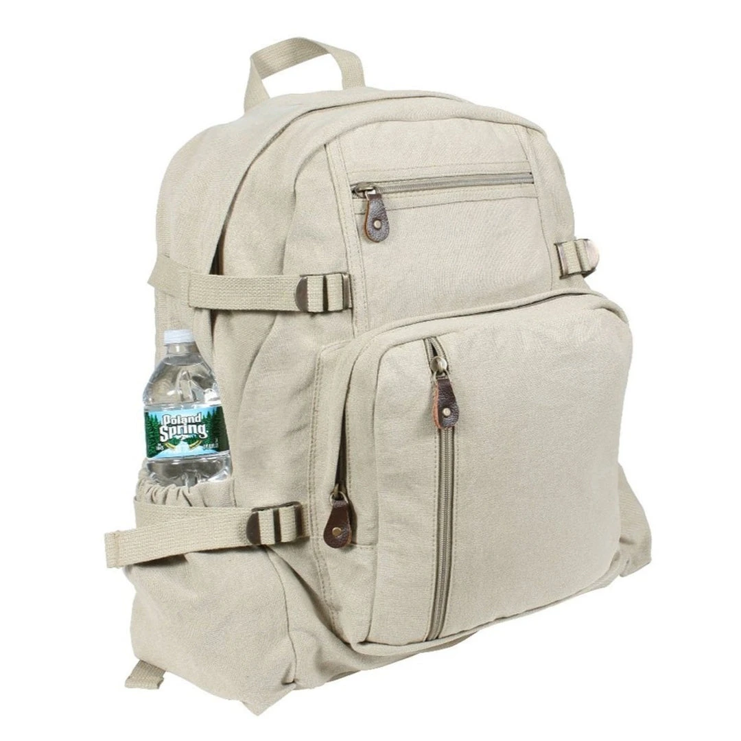 Rothco’s Jumbo Vintage Canvas Backpack is a classic backpack constructed with a vintage washed cotton canvas material. The pack features 1 large main compartment ideal for books & supplies, 3 outside zippered pouches & 2 elastic side pockets with tie down straps, great for accessories and water bottles. In addition, the canvas bag also features padded adjustable shoulder straps and a top carry handle. Rothco’s Jumbo Canvas Backpack measures 18″ x 13.5″ x 7″. Rothco also offers a more compact version of this backpack as well.