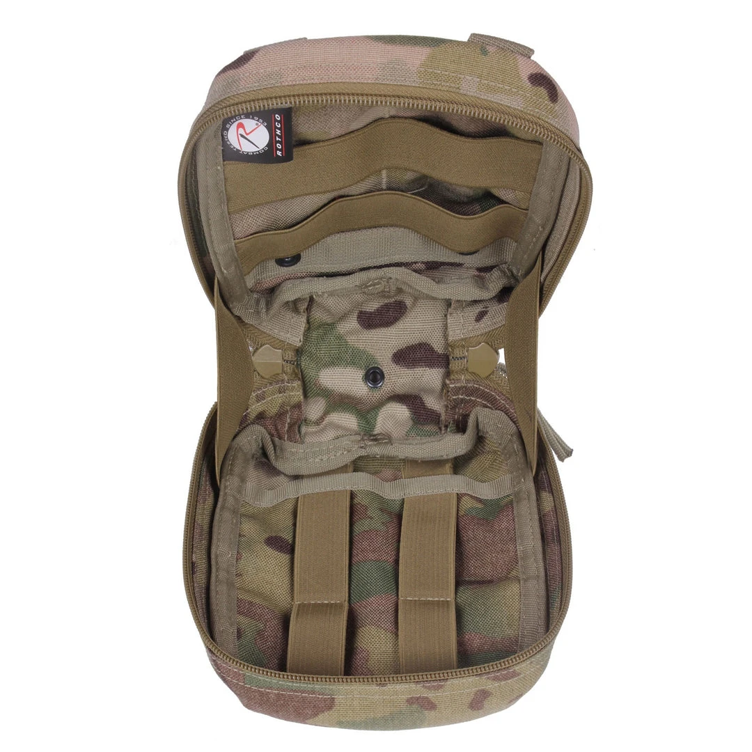Rothco’s MOLLE Tactical Trauma Kit is a compact and portable MOLLE pouch packed with over 40 essential first aid items to treat a wide range of injuries in an emergency. Featuring a full-length zipper and elastic straps, the tactical first aid kit (7″ X 8″ X 3″) can fully open for quick and easy access to your first aid gear. Made with top-quality durable denier polyester, the trauma bag is designed to withstand the most challenging conditions that come your way.