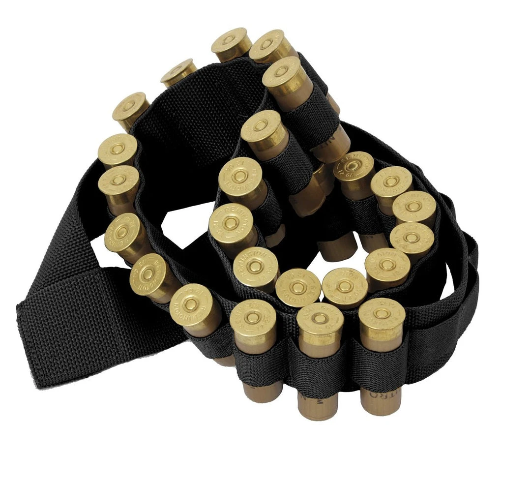 Rothco shotgun shell bandolier is made of 2 inches wide black nylon webbing; the 1.25 inch elastic holds shotgun ammo securely carries 37 rounds of shotgun ammo. The bandolier can be worn over the shoulder and across the chest. Rothco Shotgun Shell Bandolier is great for hunting and airsoft.