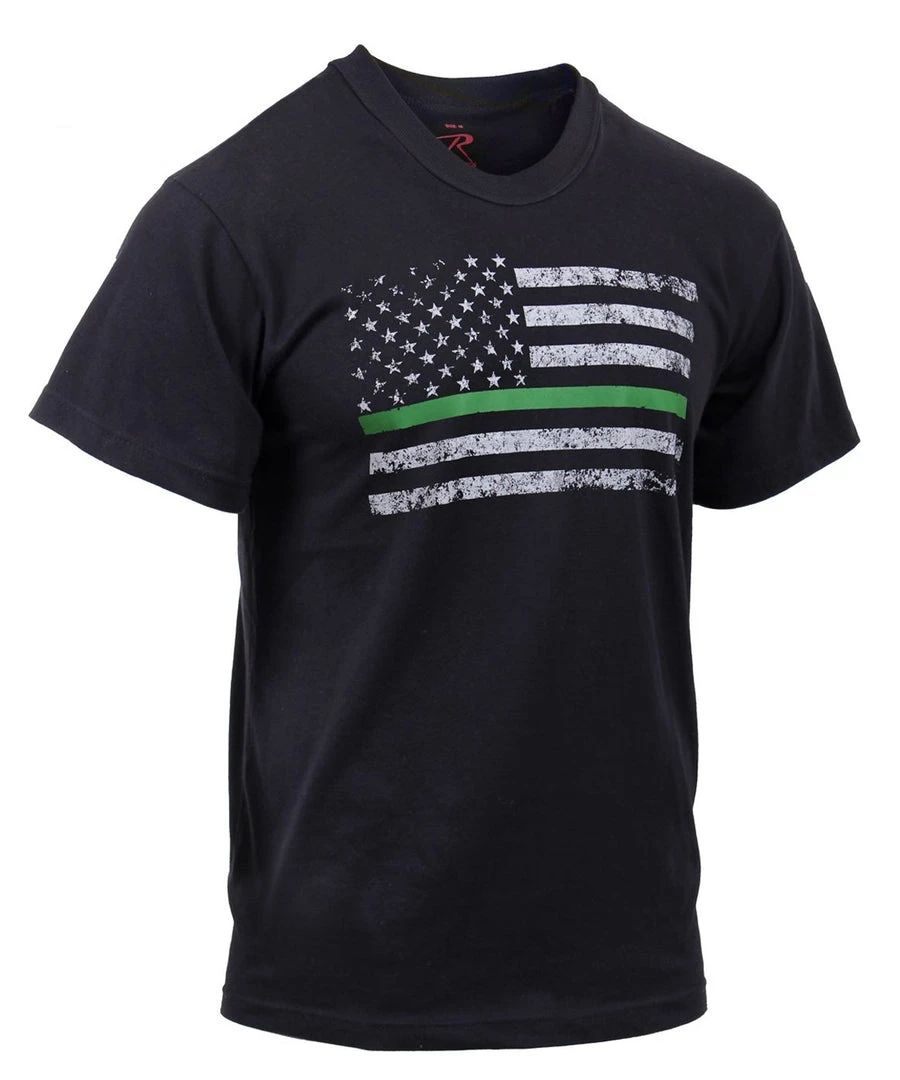 Rothco’s The Thin Green Line Flag T-shirt represents support of Federal Agents such as Border Patrol, Park Rangers, and Military Personnel. The Thin Green Line Shirt features a distressed US Flag print with a green line to highlight your support and is made from a comfortable cotton/poly blend. Proceeds from these purchase benefit families of fallen first responders.