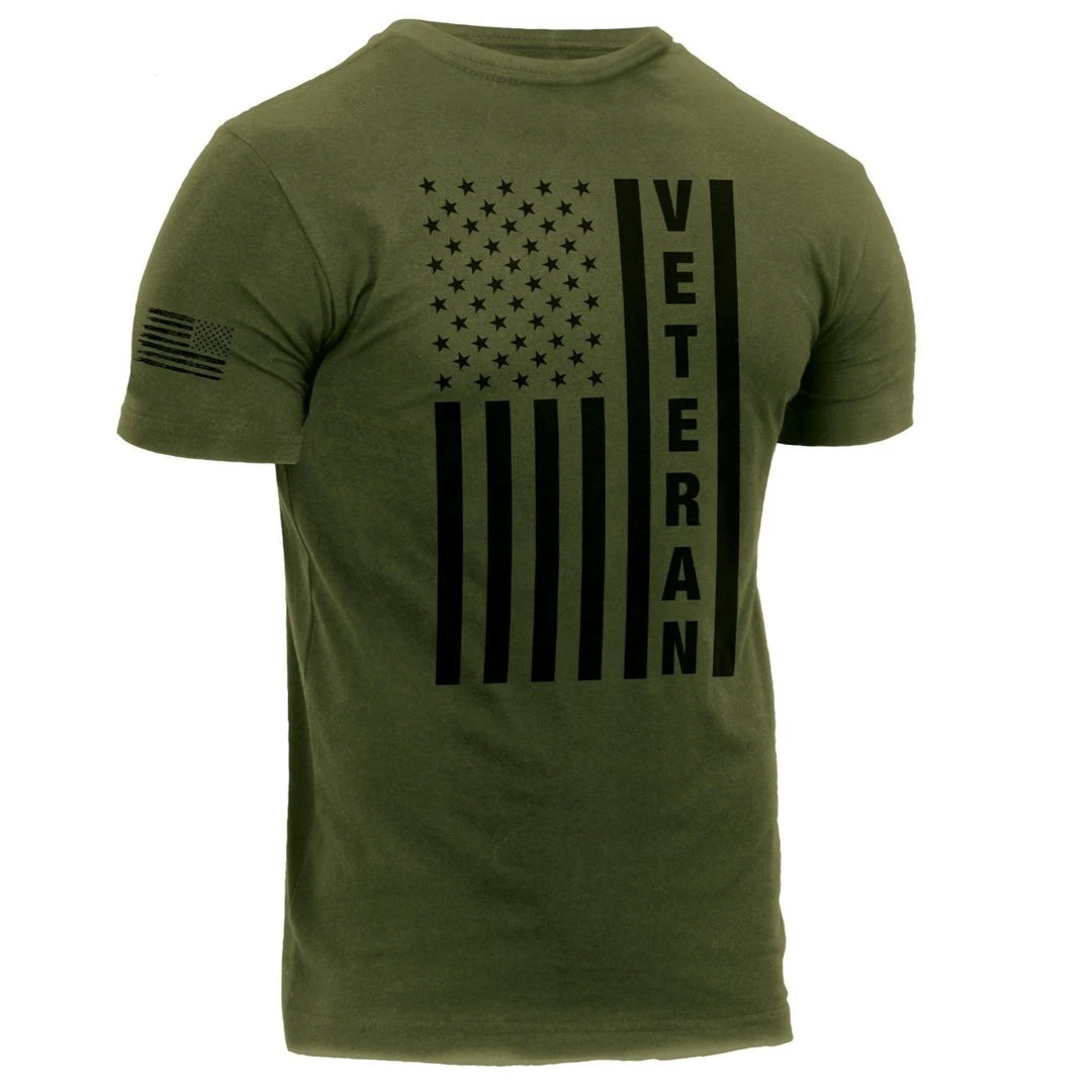 Rothco’s Veteran Flag T-Shirt features a vertical US flag with “Veteran” lettering running down the full length of the flag design. The wearer’s right sleeve features a reverse distressed US flag print, while the left sleeve displays a Rothco brand “R” logo. Made of lightweight cotton / polyester blend and a tagless printed red label, the military veteran shirt is designed to provide a comfortable fit and feel.