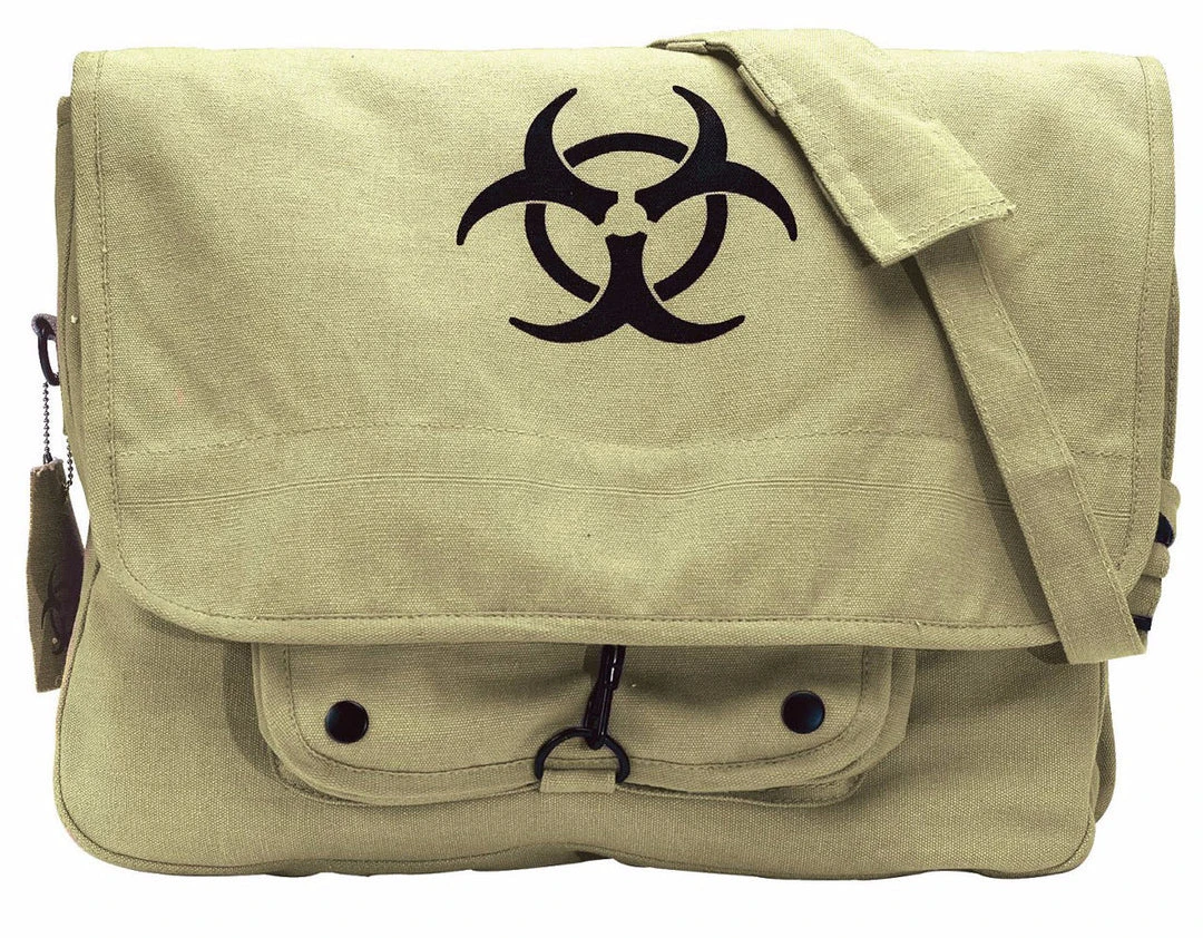 - Rothco’s Vintage Canvas Bag features “Bio-Hazard” symbol on front flap