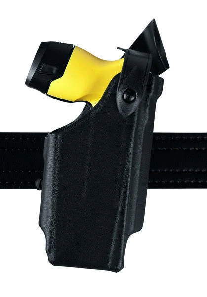 This holster W/ Self Locking System (SLS) is for electronic discharge weapons only. Without a snap, the SLS allows for a smoother, single-motion draw and greater protection against attempted weapon takeaways. It offers both strongside and cross draw carry.