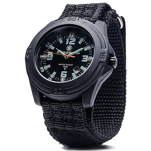 The Men’s Smith & Wesson Men’s H3 Basic Round Black Face Watch is one of the easiest in the world to read in low light conditions and even in total darkness. This watch is equipped with a tritium light source, which will provide 20 years worth of consistent glow. This tactical-tough watch is resistant to water, oil, and the most corrosive materials. From the first look, you’ll notice the black face with nylon wristband. This watch is water resistant to 100-meters (330-feet), which will stand up to the rigors of recreational scuba diving. The Soldier includes precision quartz Swiss component movement and includes 3 hands that display the hours, minutes and seconds. The watch also features a screw down stainless steel case back, shock resistant body, and a scratch resistant hardened glass that protects the dial. The hands have green tritium and the markers at 12, 3, 6 and 9 features the new Orange Tritium. The Smith & Wesson Men’s H3 Basic Round Black Face comes with a 1-year limited warranty. These merits have made Tritium H3 watches an absolute must in the emergency, safety, and protection sectors as well as in the armed forces. They are also ideal for fans of adventure and sport. Smith & Wesson is one of the world’s most recognizable brands and for good reason. Since they first opened their doors they have focused on designing and manufacturing innovative solutions that are unparalleled in the field of personal safety and protection. Almost every major law enforcement and military agency in the world has used Smith & Wesson products and to this day most police departments in the United States depend on their firearms and accessories. Smith & Wesson has been a partner to law enforcement since the late 1800s, developing crime-fighting tools that set the standard for the field and those products have enhanced public safety, security and protection all over the world.
