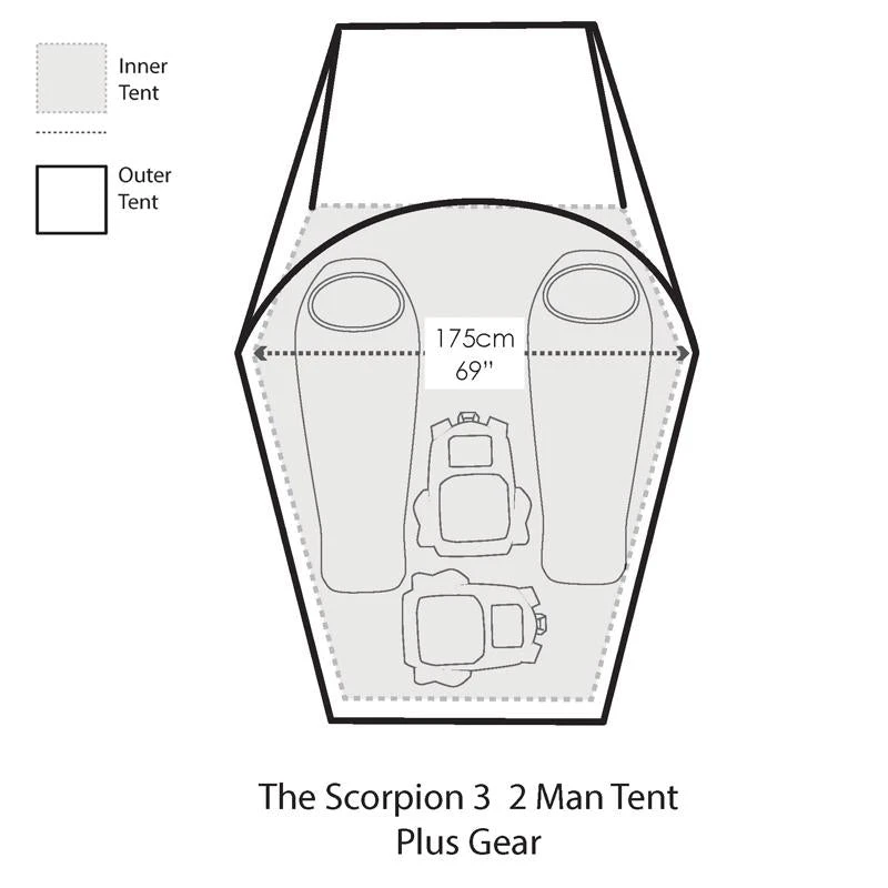 The Scorpion 3 is stalwart three-person base camp and expedition tent, when a semi- permanent camp is required. The Scorpion design is a ‚˜Fly-first‚„ pitch tent that allows quick and easy set-up using an opposing pole design, protecting you all year round from severe weather, and can be pitched in difficult and remote areas. A tried and tested favourite of Mountaineers, Climbers and Campers, the Scorpion 3 has an impressive floor space, measuring 2.25m long and 1.75m wide, as well as 1.1m of head space, creating ample room for three people in a top-toe sleeping arrangement also incorporates an ample front porch for storing equipment. In anemergencythe Scorpion 3 can accommodate six people sitting.