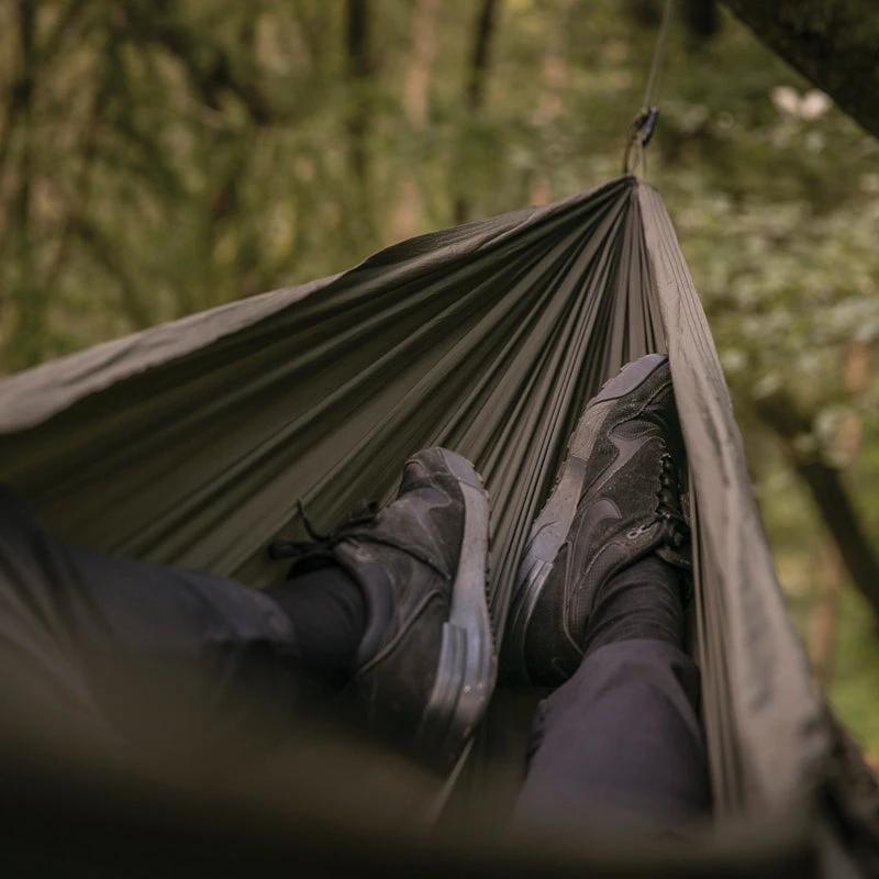 Manufactured from lightweight but extremely strong parachute nylon material, triple nylon stitched seams, folds away into its own practical stuff bag, supplied with heavy duty carabiners for easy set up. The Tropical Hammock also comes with a Suspension Attachment System to make setting up and securing around trees quicker and easier. With two steel carabiners for attaching the hammock connects very easily to the Suspension Attachment System.